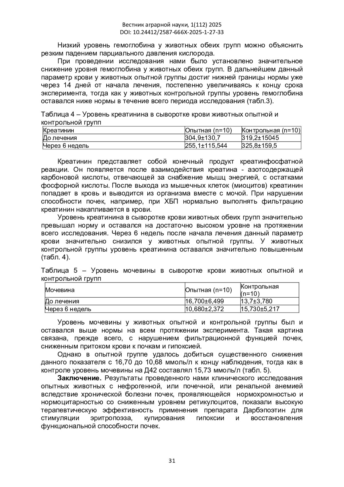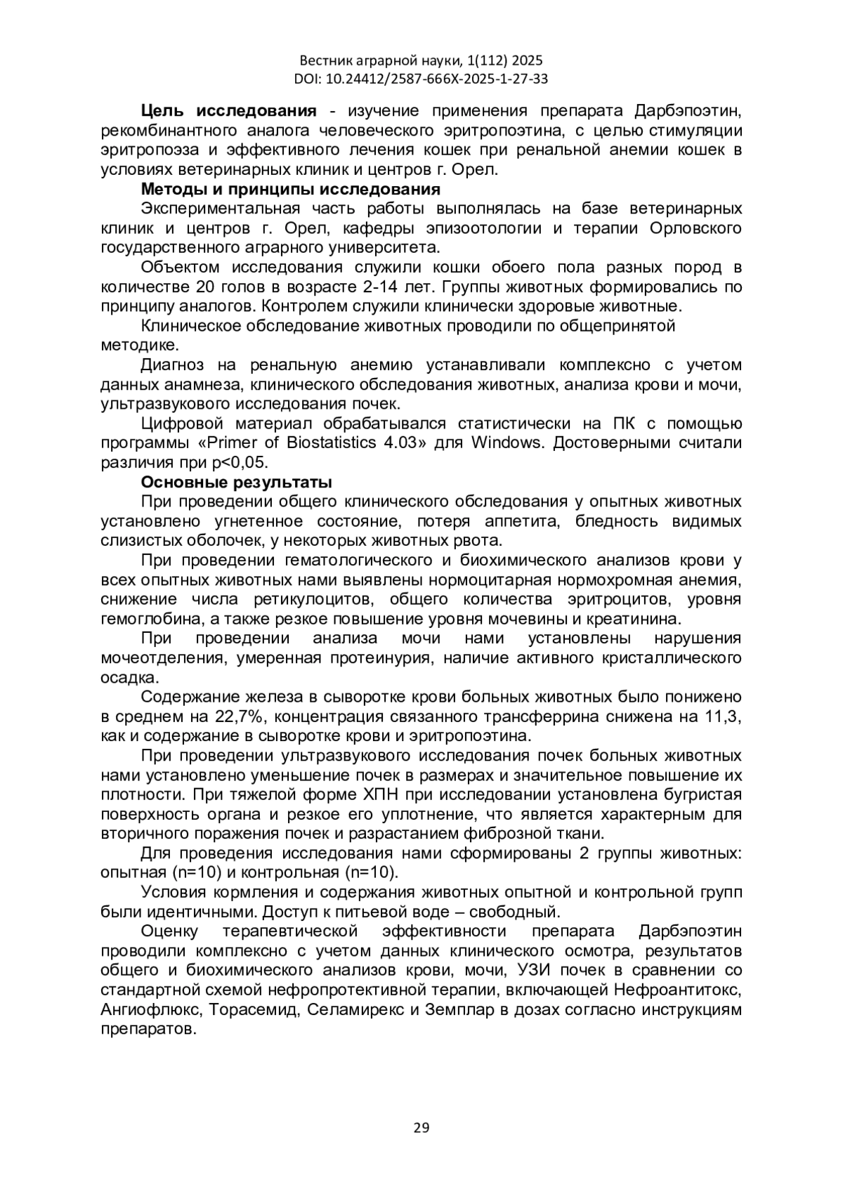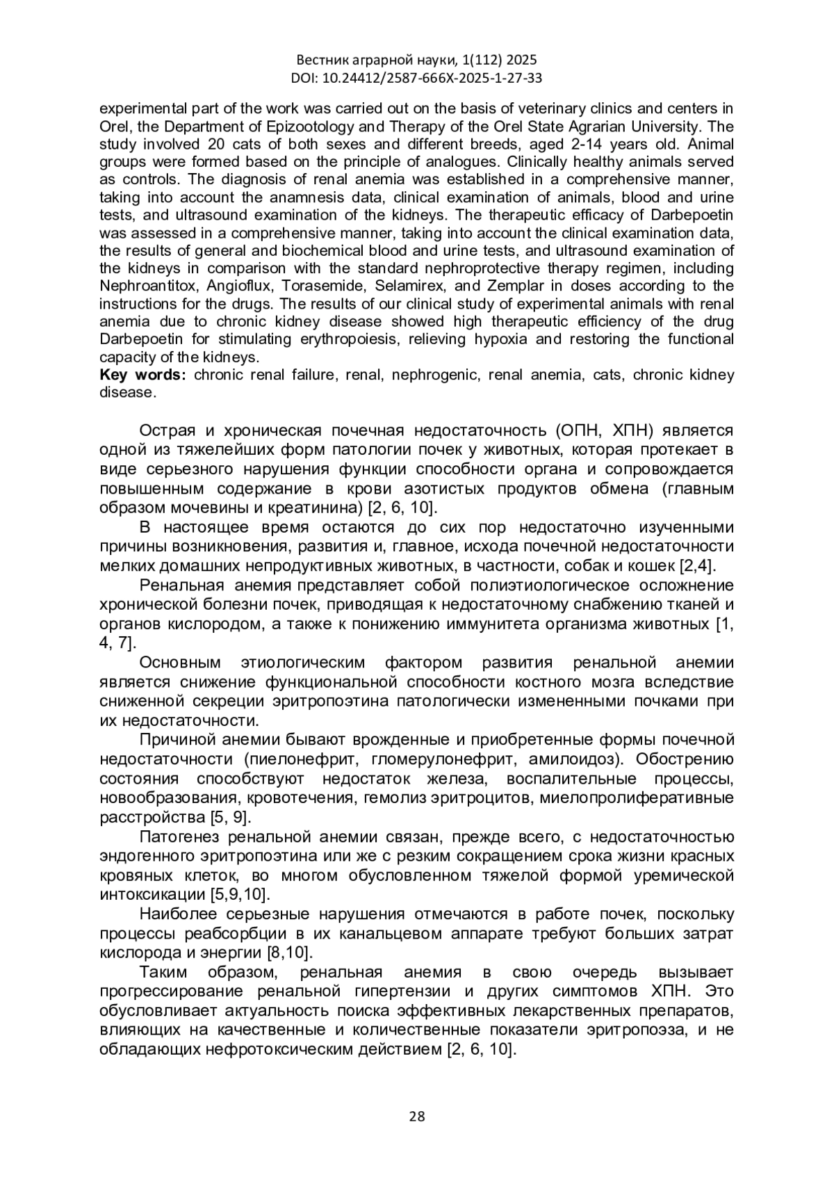Ренальная анемия представляет собой полиэтиологическое осложнение хронической болезни почек, приводящая к недостаточному снабжению тканей и органов кислородом, а также к понижению иммунитета организма животных. Целью данного исследования является изучение применения препарата Дарбэпоэтин, рекомбинантного аналога человеческого эритропоэтина, для стимуляции эритропоэза и эффективного лечения кошек при ренальной анемии в условиях ветеринарных клиник и центров г. Орел. Экспериментальная часть работы выполнялась на базе ветеринарных клиник и центров г. Орел, кафедры эпизоотологии и терапии Орловского государственного аграрного университета. Объектом исследования служили кошки обоего пола разных пород в количестве 20 голов в возрасте 2-14 лет. Группы животных формировались по принципу аналогов. Контролем служили клинически здоровые животные. Диагноз на ренальную анемию устанавливали комплексно с учетом данных анамнеза, клинического обследования животных, анализа крови и мочи, ультразвукового исследования почек. Оценку терапевтической эффективности препарата Дарбэпоэтин проводили комплексно с учетом данных клинического осмотра, результатов общего и биохимического анализов крови, мочи, УЗИ почек в сравнении со стандартной схемой нефропротективной терапии, включающей Нефроантитокс, Ангиофлюкс, Торасемид, Селамирекс и Земплар в дозах согласно инструкциям препаратов. Результаты проведенного нами клинического исследования опытных животных с ренальной анемией вследствие хронической болезни почек показали высокую терапевтическую эффективность применения препарата Дарбэпоэтин для стимуляции эритропоэза, купирования гипоксии и восстановления функциональной способности почек.