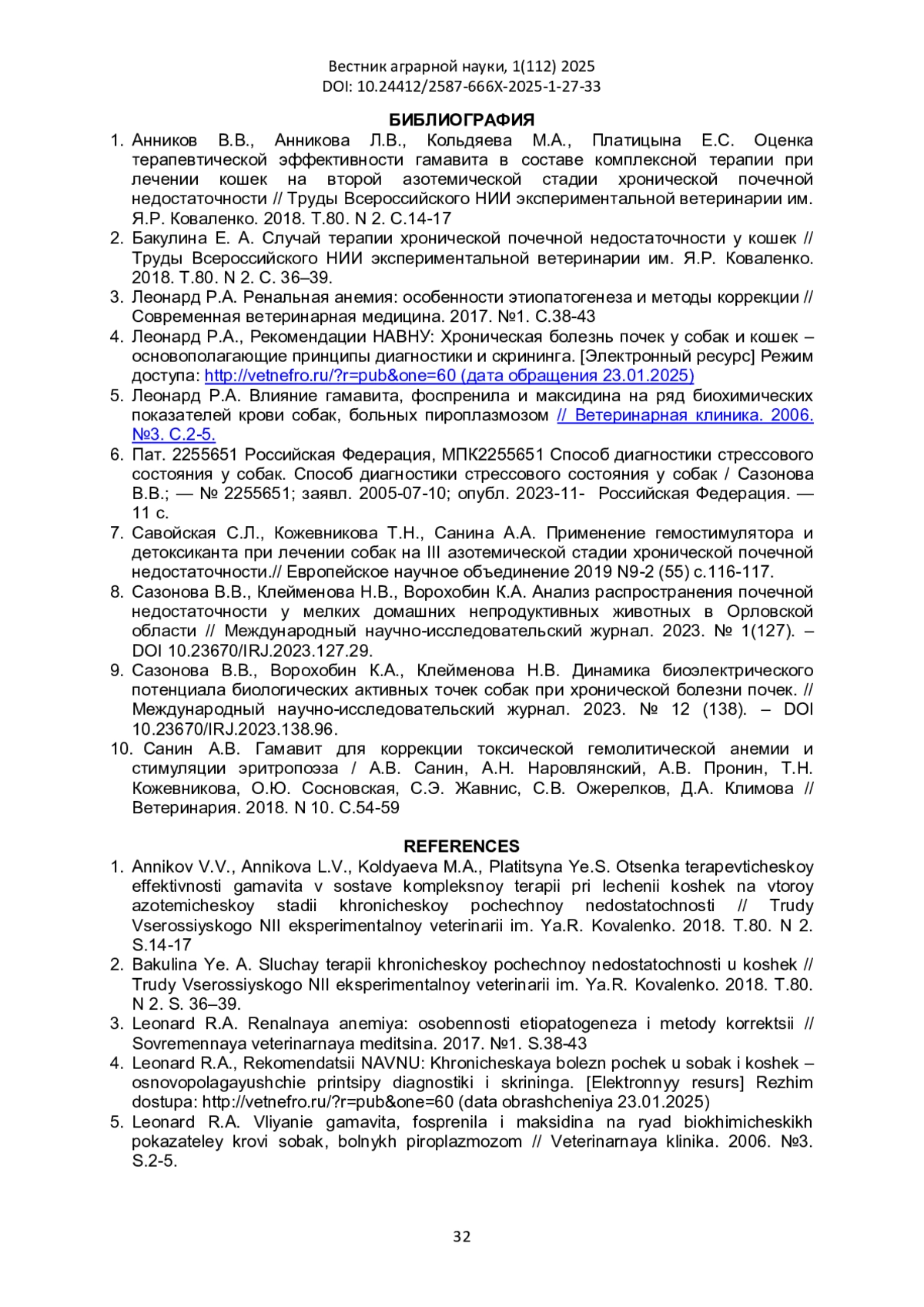 1. Анников В.В., Анникова Л.В., Кольдяева М.А., Платицына Е.С. Оценка терапевтической эффективности гамавита в составе комплексной терапии при лечении кошек на второй азотемической стадии хронической почечной недостаточности // Труды Всероссийского НИИ экспериментальной ветеринарии им. Я.Р. Коваленко. 2018. Т.80. N 2. С.14-17. EDN: YSIHBB