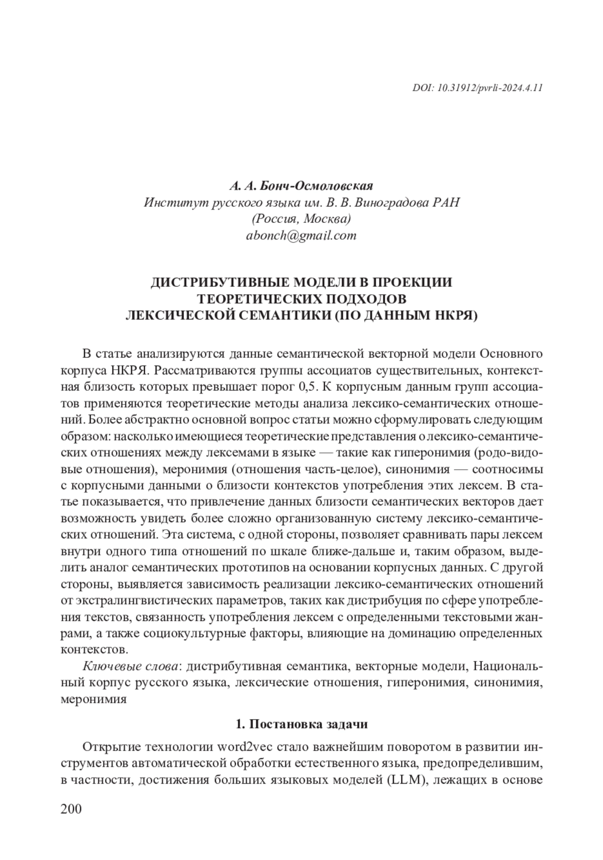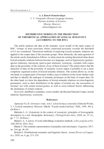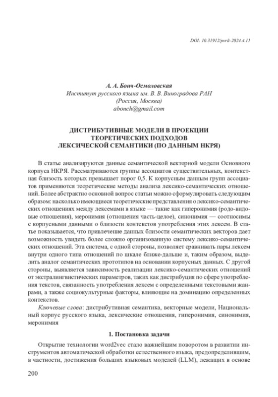 В статье анализируются данные семантической векторной модели Основного корпуса НКРЯ. Рассматриваются группы ассоциатов существительных, контекстная близость которых превышает порог 0,5. К корпусным данным групп ассоциатов применяются теоретические методы анализа лексико-семантических отношений. Более абстрактно основной вопрос статьи можно сформулировать следующим обра зом: насколько имеющиеся теоретические представления о лексико-семантических отношениях между лексемами в языке — такие как гиперонимия (родо-видовые отношения), меронимия (отношения часть-целое), синонимия — соотносимы с корпусными данными о близости контекстов употребления этих лексем. В статье показывается, что привлечение данных близости семантических векторов дает возможность увидеть более сложно организованную систему лексико-семан ти ческих отношений. Эта система, с одной стороны, позволяет сравнивать пары лексем внут ри одного типа отношений по шкале ближе-дальше и, таким образом, выделить аналог семантических прототипов на основании корпусных данных. С другой стороны, выявляется зависимость реализации лексико-семантических отношений от экстралингвистических параметров, таких как дистрибуция по сфере употребления текстов, связанность употребления лексем с определенными текстовыми жанрами, а также социокультурные факторы, влияющие на доминацию определенных контекстов