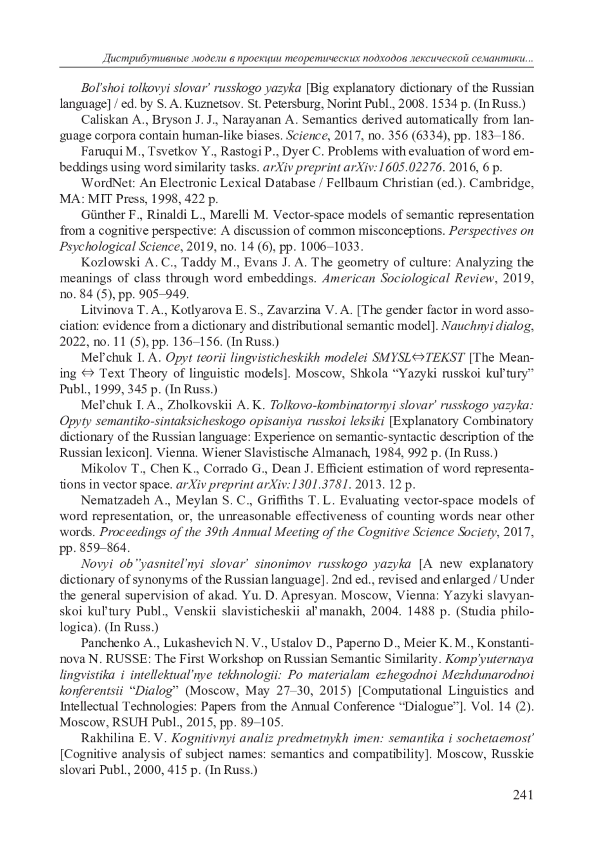 8. Панченко А., Лукашевич Н. В., Усталов Д., Паперно Д., Мейер К. М., Константинова Н.RUSSE: семинар по оценке семантической близости для русского языка. Компьютерная лингвистика и интеллектуальные технологии: По материалам ежегодной Международной конференции “Диалог” (Москва, 27-30 мая 2015). Вып. 14. Т. 2. М.: Изд-во РГГУ, 2015. С. 89-105.