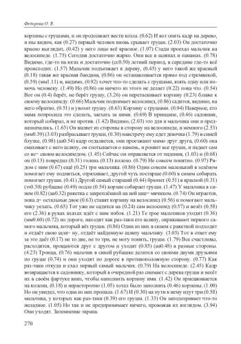 9. Fedorova O. V. “Pears Film” live: Cognitive peculiarities of the reportage // Компьютерная лингвистика и интеллектуальные технологии: По материалам ежегодной международной конференции “Диалог”. М.: РГГУ, 2022. № 21. C. 203-210.