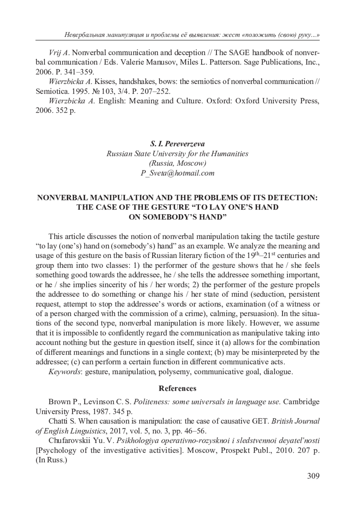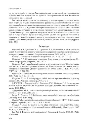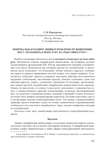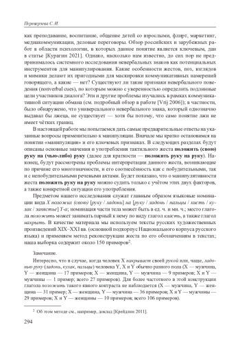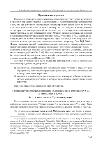 В работе на примере тактильного жеста положить (свою) руку на (чью-либо) руку обсуждается понятие невербальной манипуляции. На материале русских художественных произведений XIX–XXI вв. анализируются значения и употребления этого жеста. Выделяются две основные группы его употреблений: 1) исполнитель жеста показывает, что испытывает тёплые чувства к адресату, сообщает ему какую-то важную информацию или даёт понять, что говорит искренне; 2) исполнитель побуждает адресата совершить некоторые действия или измениться внутренне (соблазнение, настойчивая просьба, попытка остановить слова или действия адресата, допрос, успокоение, убеждение). В ситуациях, представленных второй группой употреблений, невербальная манипуляция более вероятна. Однако, на наш взгляд, по одному только жесту невозможно с уверенностью судить о манипулятивном характере коммуникации, поскольку рассматриваемый жест (а) допускает совмещение разных значений и функций в одном контексте; (б) может быть неверно интерпретирован адресатом; (в) может выполнять одну и ту же функцию в разных коммуникативных актах. Тем самым, о манипулятивном характере диалога позволяют судить не столько семантические и функциональные особенности того или иного невербального знака, сколько конкретная ситуация его употребления