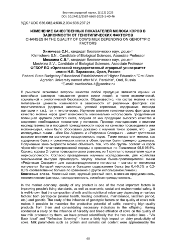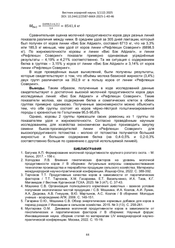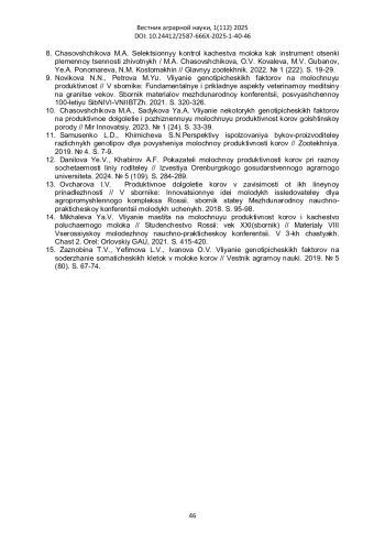 12. Данилова Е.В., Хабиров А.Ф. Показатели молочной продуктивности коров при разной сочетаемости линий родителей // Известия Оренбургского государственного аграрного университета. 2024. № 5 (109). С. 284-289. EDN: BXJNVU