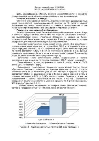 В рыночной экономике вопросы качества любой продукции являются одними из важнейших факторов повышения уровня жизни людей, а также экономической, социальной и экологической безопасности. Общеизвестно, что состав молока и его питательная ценность изменяются в зависимости от различных факторов: как паратипических (здоровья животных, условий кормления, содержания, периода лактации и т. п.), так и генотических. Изучение влияния генотипических факторов на качество молока коров дают возможность максимально использовать продуктивный потенциал крупного рогатого скота, получая от них продукцию высокого качества и закрепляя необходимые показатели у потомков. Проведя исследование о влиянии наследственности и породной принадлежности коров на качество производимого ими молока-сырья, нами было обосновано доказано с научной точки зрения, что две исследуемые линии - «Вис Бэк Айдиал» и «Рефлекшн Соверинг» - имеют достаточно высокое влияние на молочную продуктивность коров. Такие показатели молока, как содержание белка и соматических клеток в обеих группах были примерно одинаковы. Полученные закономерности можно объяснить тем, что обе группы состоят из коров чёрно-пёстрой голштинизированной породы с кровностью по Голштинам 95,5-95,6%. Однако, коровы 2 группы превзошли своих ровесниц из 1 группы по показателям удоя и жирномолочности. Согласно проведённым научным исследованиям, для хозяйства экономически выгодно производить закупку семени быков-производителей линии «Рефлекшн Соверинг» для высокопродуктивного потомства - молоко от потомства получается большей жирностью и большим содержанием белка (на 0,4-0,5% и 0,2-0,3% соответственно больше по сравнению с другой используемой линией).
