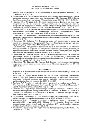 9. Новикова Н.Н., Петрова М.Ю. Влияние генотипических факторов на молочную продуктивность // В сборнике: Фундаментальные и прикладные аспекты ветеринарной медицины на границе веков. Сборник материалов международной конференции, посвященной 100-летию СибНИВИ-ВНИИБТЖ. 2021. С. 320-326. EDN: KFONCU