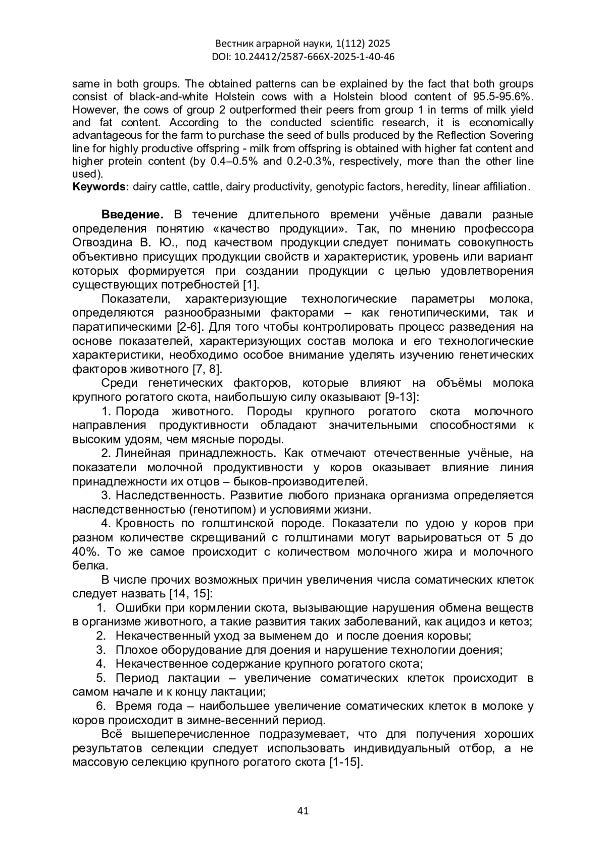 15. Зазнобина Т.В., Ефимова Л.В., Иванова О.В. Влияние генотипических факторов на содержание соматических клеток в молоке коров // Вестник аграрной науки. 2019. № 5 (80). С. 67-74. EDN: MXKDZX