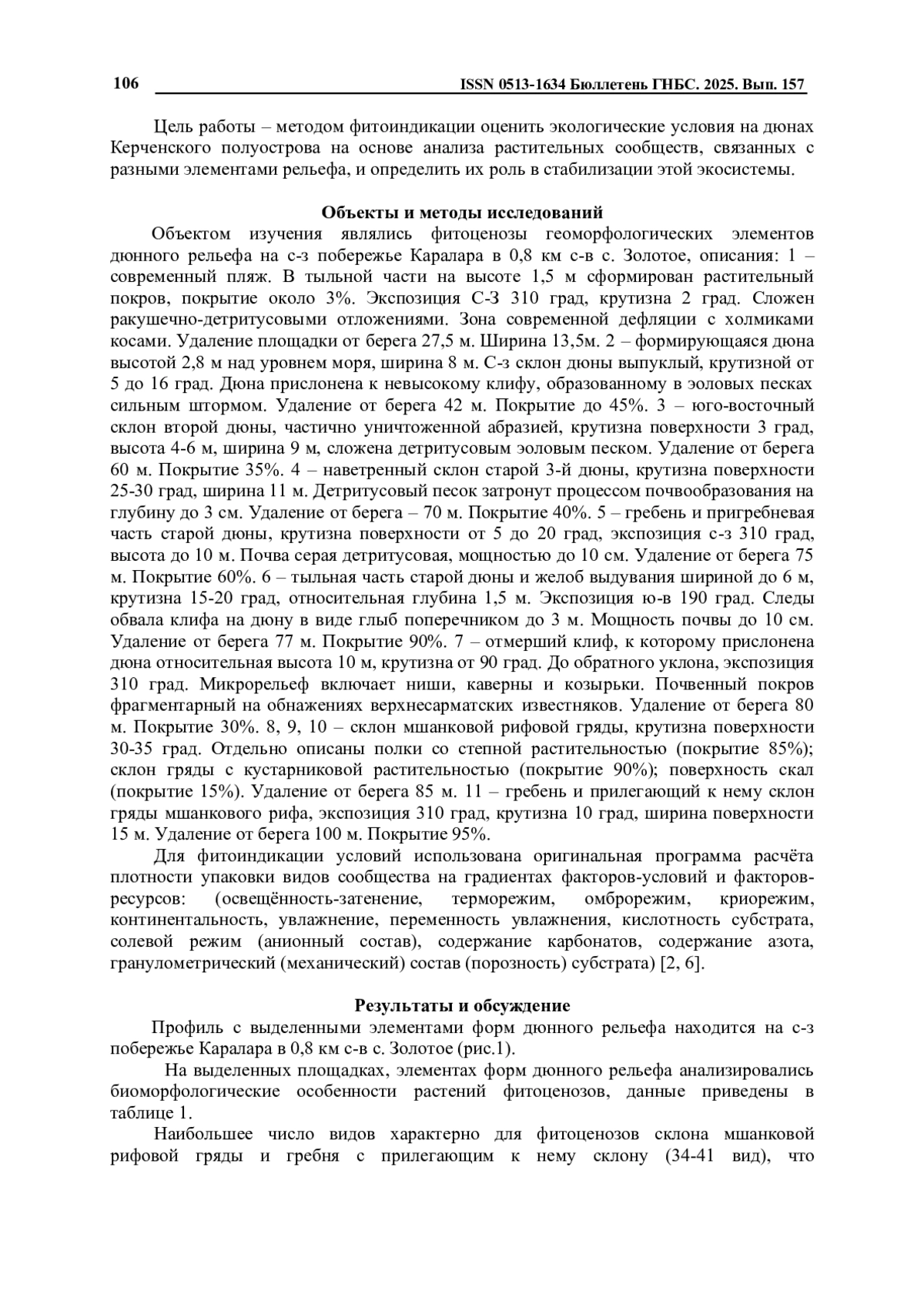 В статье представлены результаты фитоиндикации условий среды на прислоненных дюнах северо-западного побережья Каралар 0,8 км с-в с. Золотое (Крым, Керченский полуостров). Методом синтаксономического анализа выявлены уникальные фитоценозы, не имеющие аналогов в Средиземноморье, которые связаны с различными элементами дюнного рельефа: от современного пляжа до отмершего клифа и мшанковой рифовой гряды. Для каждого из 11 описанных сообществ проанализированы видовое разнообразие, биоморфологический состав (жизненные формы, структура побегов и корневых систем) и экоморфологические спектры. С использованием оригинальной программы расчета определено положение сообществ на градиентах факторов-условий (освещенность, терморежим, увлажнение, континентальность и др.) и факторов-ресурсов (кислотность, засоленность, содержание карбонатов и азота, аэрация субстрата). Установлено, что растительные сообщества прислоненных дюн с высокой вероятностью (73-100%) индицируют специфические формы рельефа. Подчеркивается важность сохранения растительного покрова для поддержания стабильности дюнных экосистем в условиях рекреационных нагрузок.