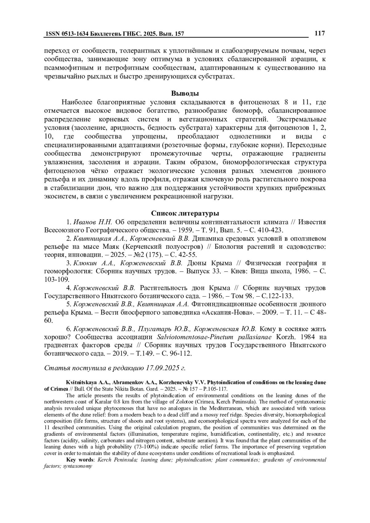 2. Квитницкая А.А., Корженевский В.В. Динамика средовых условий в оползневом рельефе на мысе Маяк (Керченский полуостров) // Биология растений и садоводство: теория, инновации. - 2025. - №2 (175). - С. 42-55.