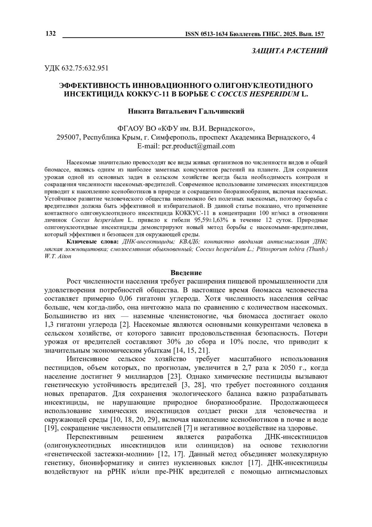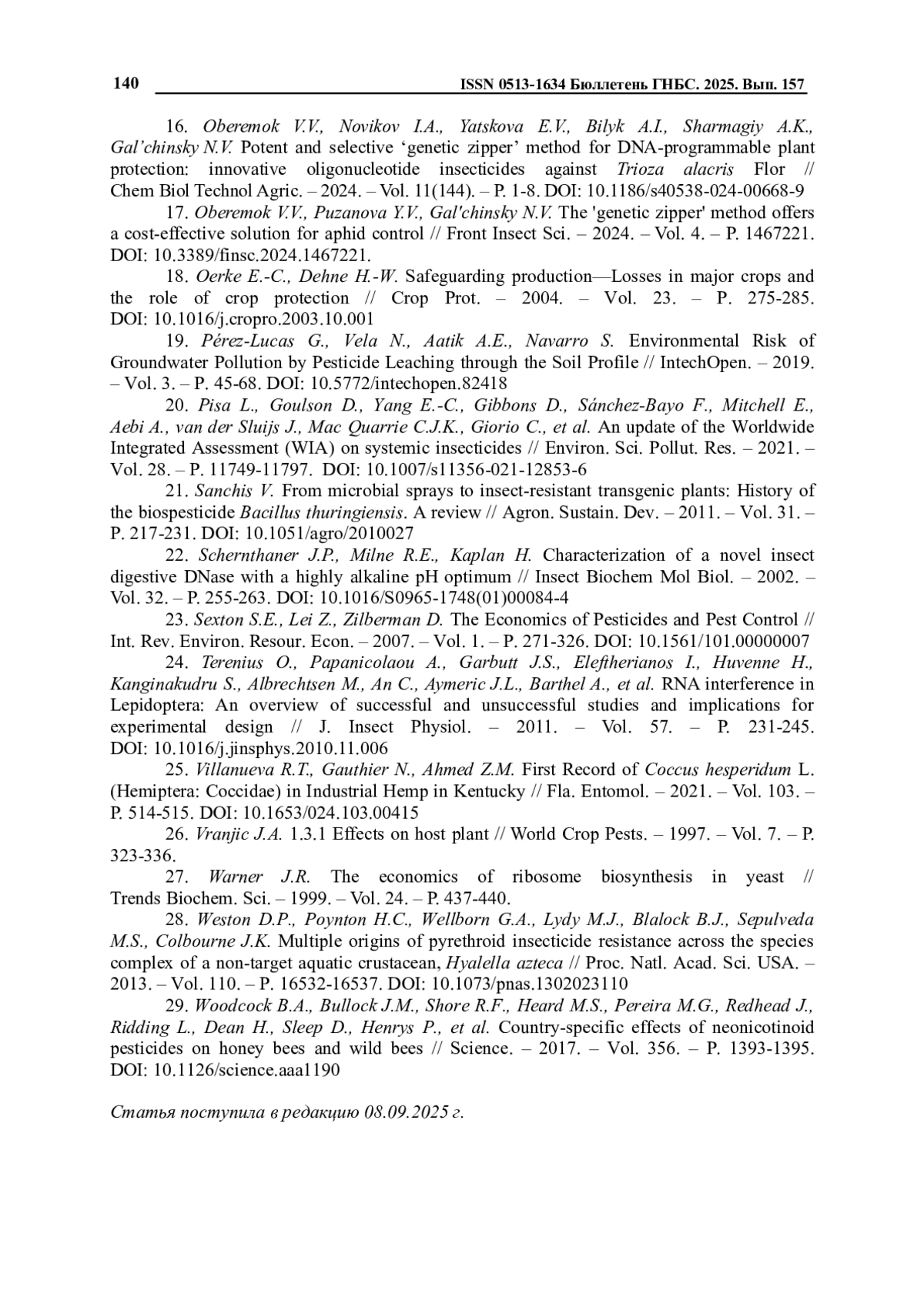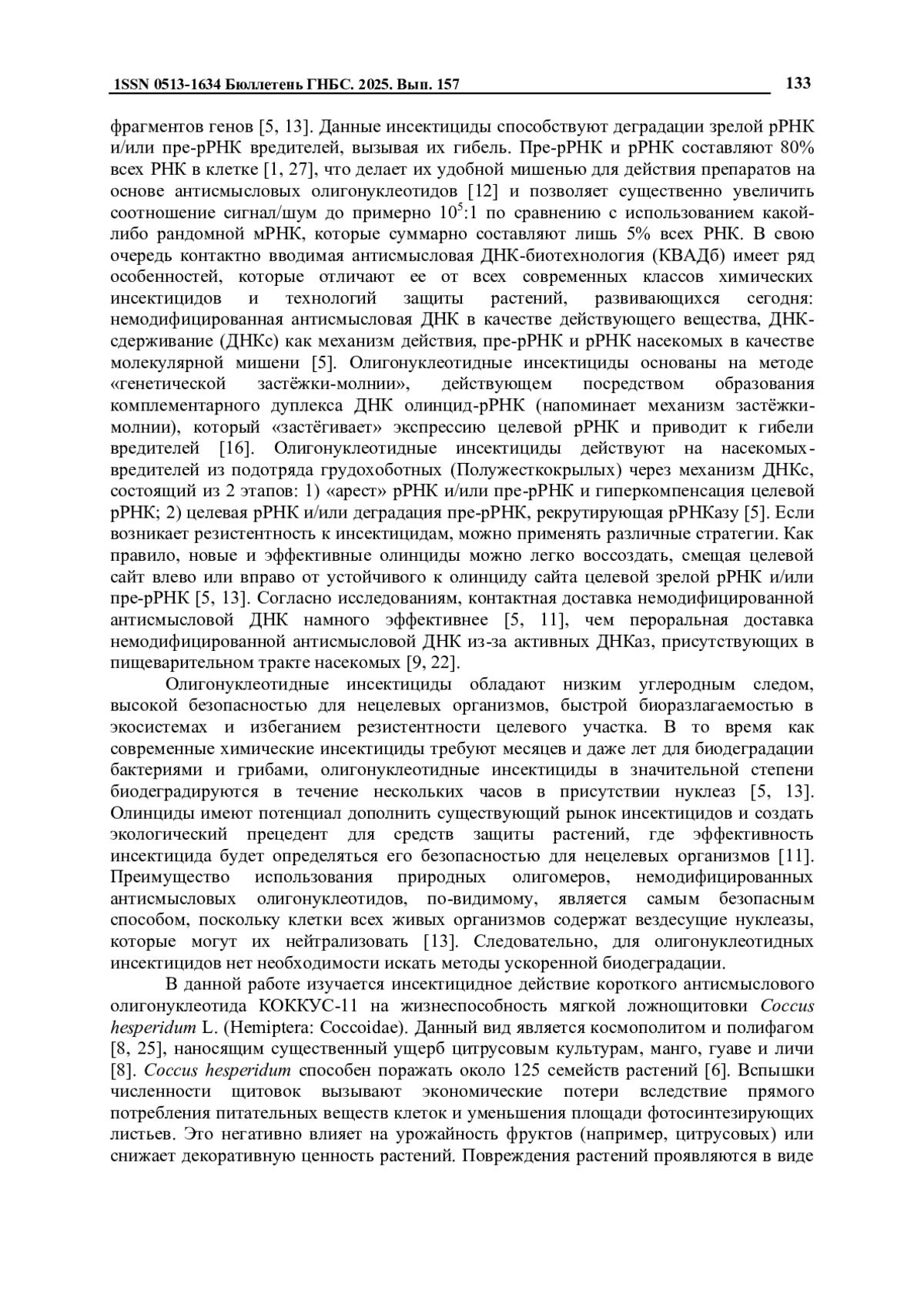 5. Gal’chinsky N.V., Yatskova E.V., Novikov I.A., Sharmagiy A.K., Plugatar Y.V., Oberemok V.V. Mixed insect pest populations of Diaspididae species under control of oligonucleotide insecticides: 3′-end nucleotide matters // Pesticide Biochem Physiol. - 2024. - Vol. 200. - P. 105838. DOI: 10.1016/j.pestbp.2024.105838