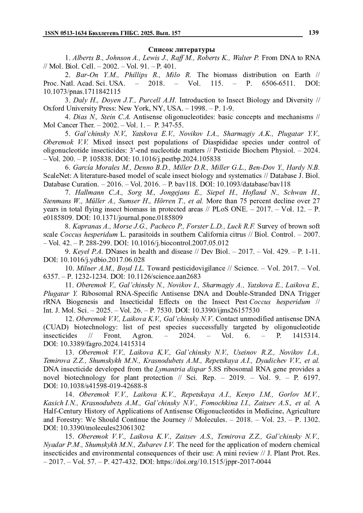 11. Oberemok V., Gal’chinsky N., Novikov I., Sharmagiy A., Yatskova E., Laikova E., Plugatar Y. Ribosomal RNA-Specific Antisense DNA and Double-Stranded DNA Trigger rRNA Biogenesis and Insecticidal Effects on the Insect Pest Coccus hesperidum // Int. J. Mol. Sci. - 2025. - Vol. 26. - P. 7530. DOI: 10.3390/ijms26157530