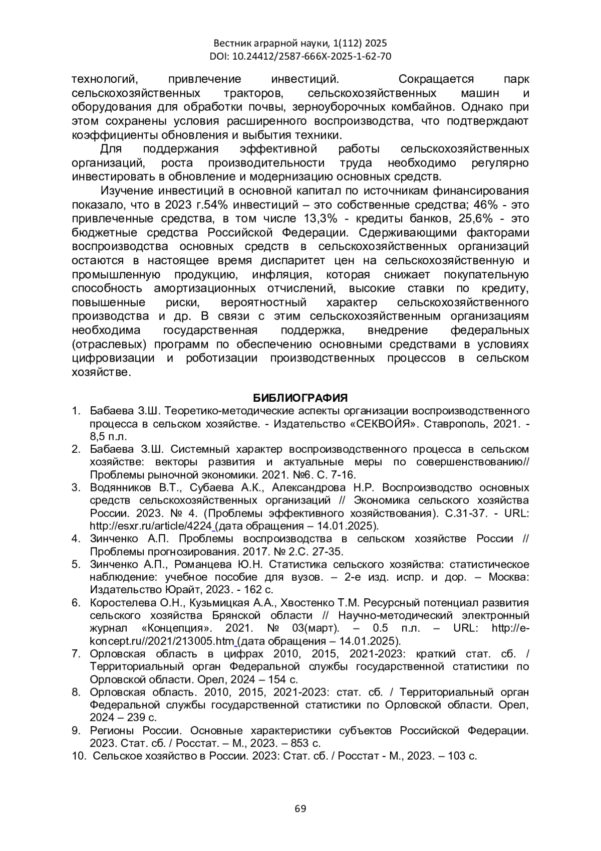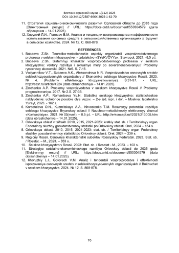 2. Бабаева З.Ш. Системный характер воспроизводственного процесса в сельском хозяйстве: векторы развития и актуальные меры по совершенствованию// Проблемы рыночной экономики. 2021. №6. С. 7-16.