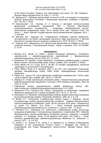1. Бондина Н.Н., Бондин И.А. Анализ и оценка состояния дебиторской и кредиторской задолженности в сельскохозяйственных организациях // Международный сельскохозяйственный журнал. 2020. № 1. С. 40-42. EDN: DYCVUC