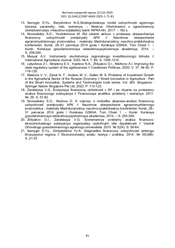 16. Latysheva Z.I., Skripkina E.V., Kopteva N.A., Zhilyakov D.I., Nikiforov A.I. Improving the state regulatory system of the agribusiness // Cuestiones Políticas. 2020. V. 37. № 65. P. 116-126. EDN: KUIKHG