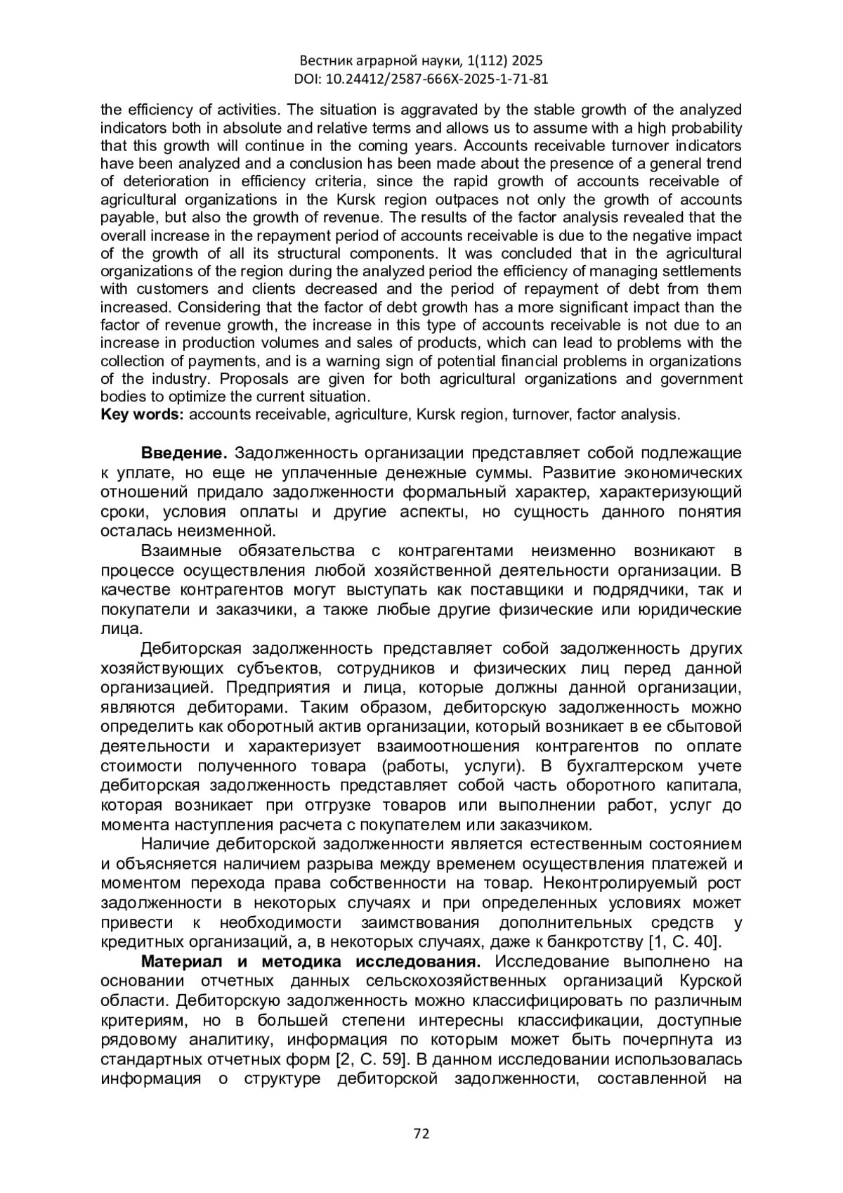 В статье на основе данных сельскохозяйственных организаций Курской области проведена оценка структуры, динамики и оборачиваемости дебиторской задолженности. Рассмотрены научные и нормативные подходы к содержанию и классификации видов, а также экономическая природа формирования задолженности. Выявлен существенный рост дебиторской задолженности в сельскохозяйственных организациях региона, который опережает рост кредиторской задолженности, что свидетельствует о том, что общая сумма долгов сельскохозяйственным предприятиям превышает задолженность самих предприятий, а это отвлекает средства из оборота и потенциально снижает эффективность деятельности. Ситуация усугубляется стабильным ростом анализируемых показателей как в абсолютном, так и в относительном выражении и позволяет с высокой вероятностью предположить, что в ближайшие годы этот рост продолжится. Проанализированы показатели оборачиваемости дебиторской задолженности и сделан вывод о наличии общей тенденции ухудшения критериев эффективности, т. к. стремительный рост дебиторской задолженности сельскохозяйственных организаций Курской области опережает не только рост кредиторской задолженности, но и рост выручки. По результатам факторного анализа выявлено, что общее увеличение срока погашения дебиторской задолженности обусловлено отрицательным влиянием роста всех ее структурных составляющих. Сделан вывод, что в сельскохозяйственных организациях региона за анализируемый период снизилась эффективность управления расчетами с покупателями и заказчиками и увеличился срок возврата задолженности от них. Учитывая, что фактор роста задолженности оказывает более существенное влияние, чем фактор роста выручки, увеличение данного вида дебиторской задолженности не обусловлено увеличением объемов производства и реализации продукции, что может привести к проблемам со сбором платежей, и является предупреждающим признаком возникновения потенциальных финансовых проблем в организациях отрасли. Приведены предложения как для сельскохозяйственных организаций, так и для органов государственной власти по оптимизации сложившейся ситуации.