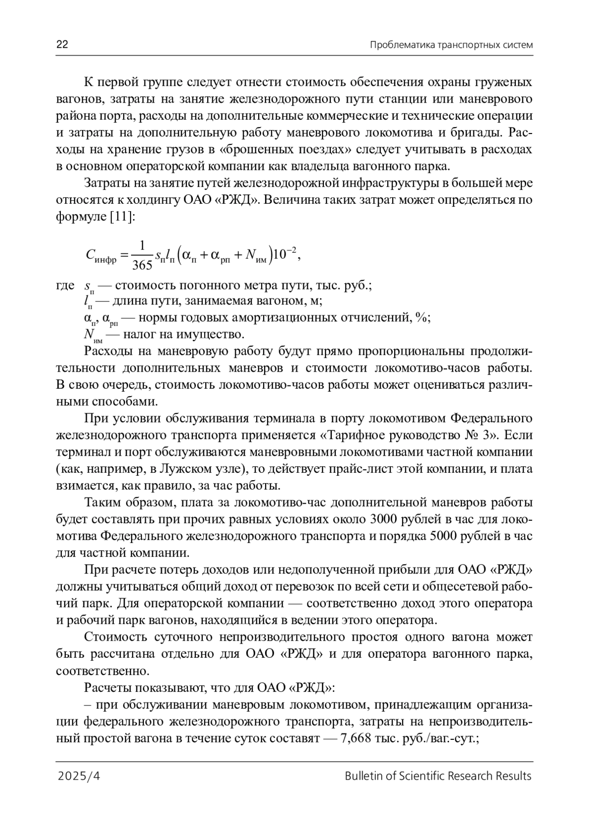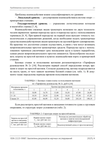 Цель: Заключается в анализе, выявлении и учете всех затрат, связанных с непроизводительным простоем вагонов при взаимодействии железнодорожного и морского видов транспорта. На уровне припортовой станции-порта особенно актуальны вопросы технологии взаимодействия при передаче грузопотока. Выбор технологического варианта передачи грузопотока в условиях ограниченности ресурсов железнодорожной инфраструктуры и тягового подвижного состава должен быть экономически обоснован. Прямой вариант перегрузки груза с одного вида транспорта на другой увеличивает риски непроизводительного простоя вагонов, так как технологически и организационно сложно одновременно подготовить судно и подать вагоны под грузовые операции. Целесообразно выявить и учесть все затраты, связанные с возможными непроизводительными простоями вагонов. Методы: Анализ, синтез, формализация. Результаты: Было установлено, что базовые ставки по «Тарифному руководству № 2» не учитывают всех расходов на непроизводительный простой вагонов. Получены различные значения стоимости непроизводительного простоя для ОАО «РЖД» и операторской компании для двух вариантов маневрового обслуживания, учитывающих разную стоимость локомотиво-часа маневровой работы. Построены диаграммы детализации затрат на непроизводительный простой вагонов по различным категориям. Обосновано технологическое решение перегрузки груза при взаимодействии железнодорожного и морского транспорта с использованием терминала. Практическая значимость: Результаты работы имеют практическое значение для организации работы на припортовых станциях и в железнодорожных районах порта ОАО «РЖД» и операторских компаний. Выявлены скрытые затраты при непроизводительном простое вагонов для ОАО «РЖД» и операторских компаний при двух вариантах маневрового обслуживания.