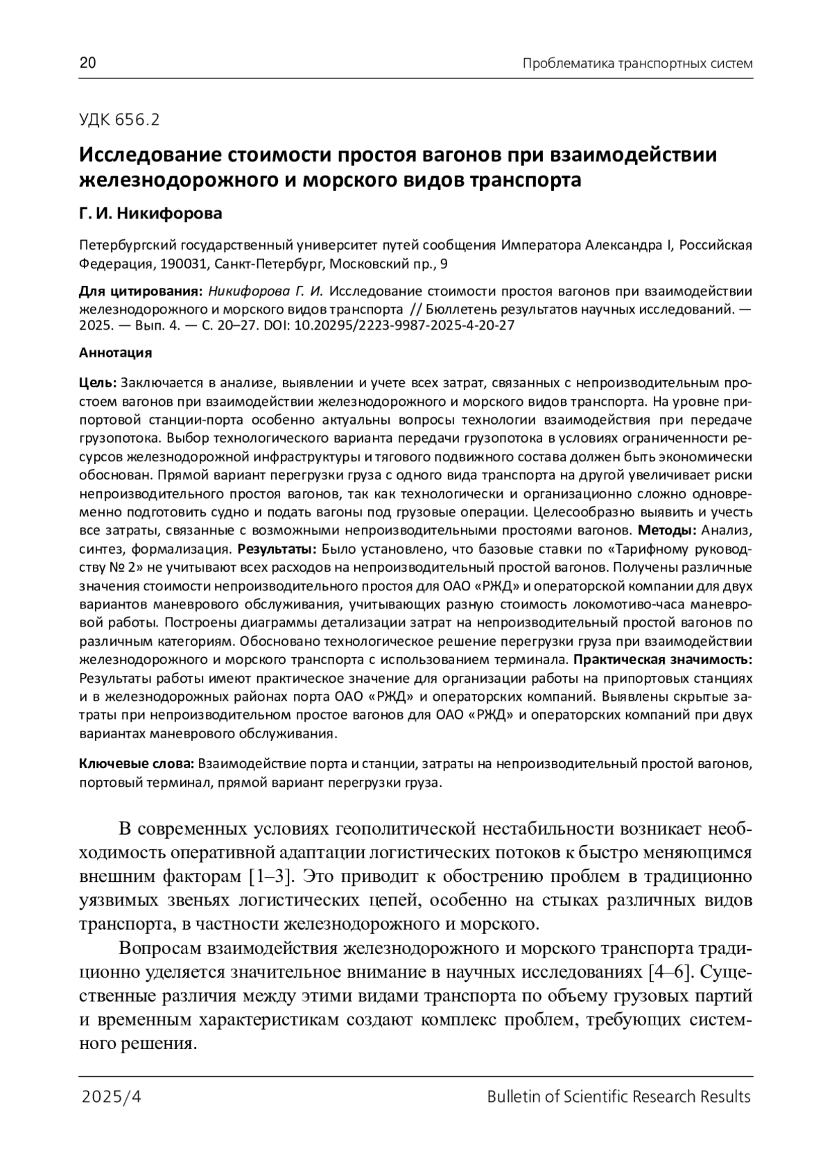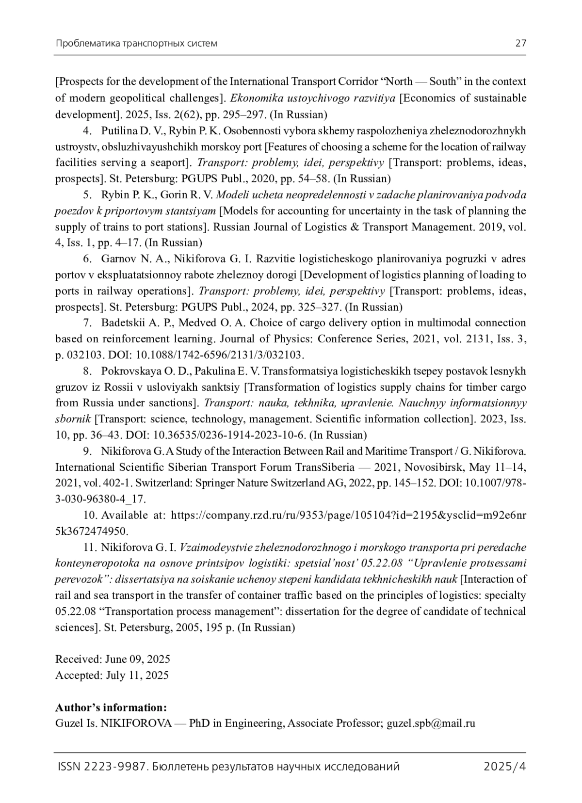 9. Nikiforova G. A Study of the Interaction Between Rail and Maritime Transport / G. Nikiforova // International Scientific Siberian Transport Forum TransSiberia - 2021, Novosibirsk, May 11-14, 2021. - Vol. 402-1. - Switzerland: Springer Nature Switzerland AG, 2022. - Pp. 145- 152. - 10.1007/978-3-030-96380-4_17. 10. URL: https://company.rzd.ru/ru/9353/page/105104?id=2195&ysclid=m92e6nr5k3672474950. DOI: 10.1007/978-3-030-96380-4_17.10
