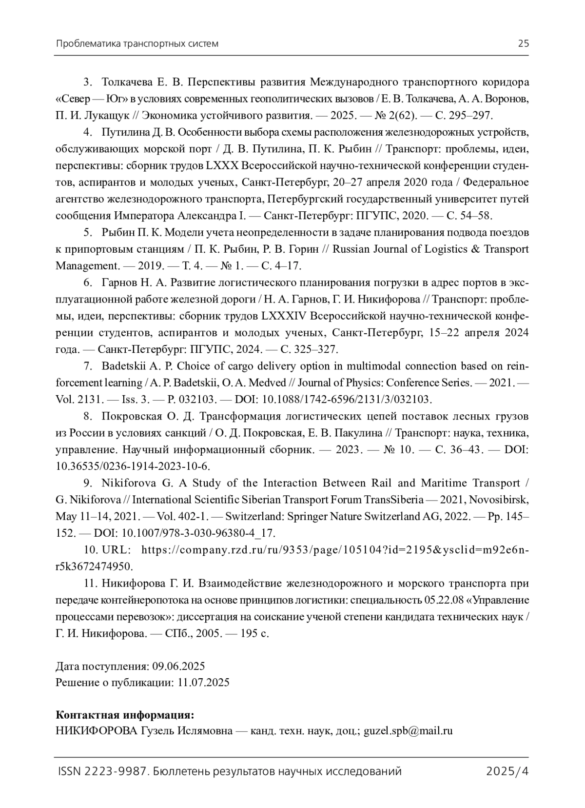 6. Гарнов Н. А. Развитие логистического планирования погрузки в адрес портов в эксплуатационной работе железной дороги / Н. А. Гарнов, Г. И. Никифорова // Транспорт: проблемы, идеи, перспективы: сборник трудов LXXXIV Всероссийской научно-технической конференции студентов, аспирантов и молодых ученых, Санкт-Петербург, 15-22 апреля 2024 года. - Санкт-Петербург: ПГУПС, 2024. - С. 325-327.