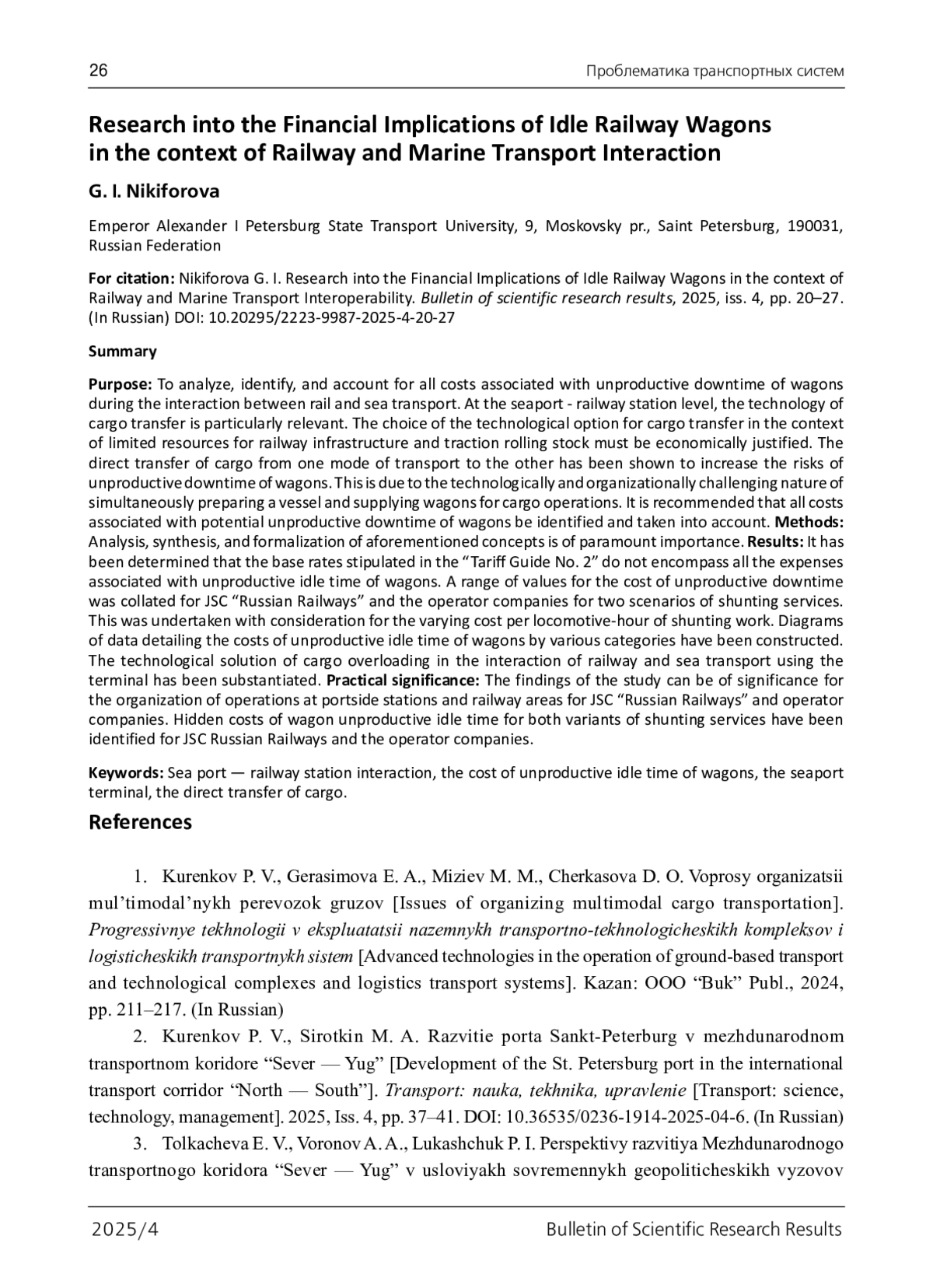 2. Куренков П. В. Развитие порта Санкт-Петербург в международном транспортном коридоре “Север - Юг” / П. В. Куренков, М. А. Сироткин // Транспорт: наука, техника, управление. Научный информационный сборник. - 2025. - № 4. - С. 37-41. - 10.36535/0236- 1914-2025-04-6. DOI: 10.36535/0236-1914-2025-04-6