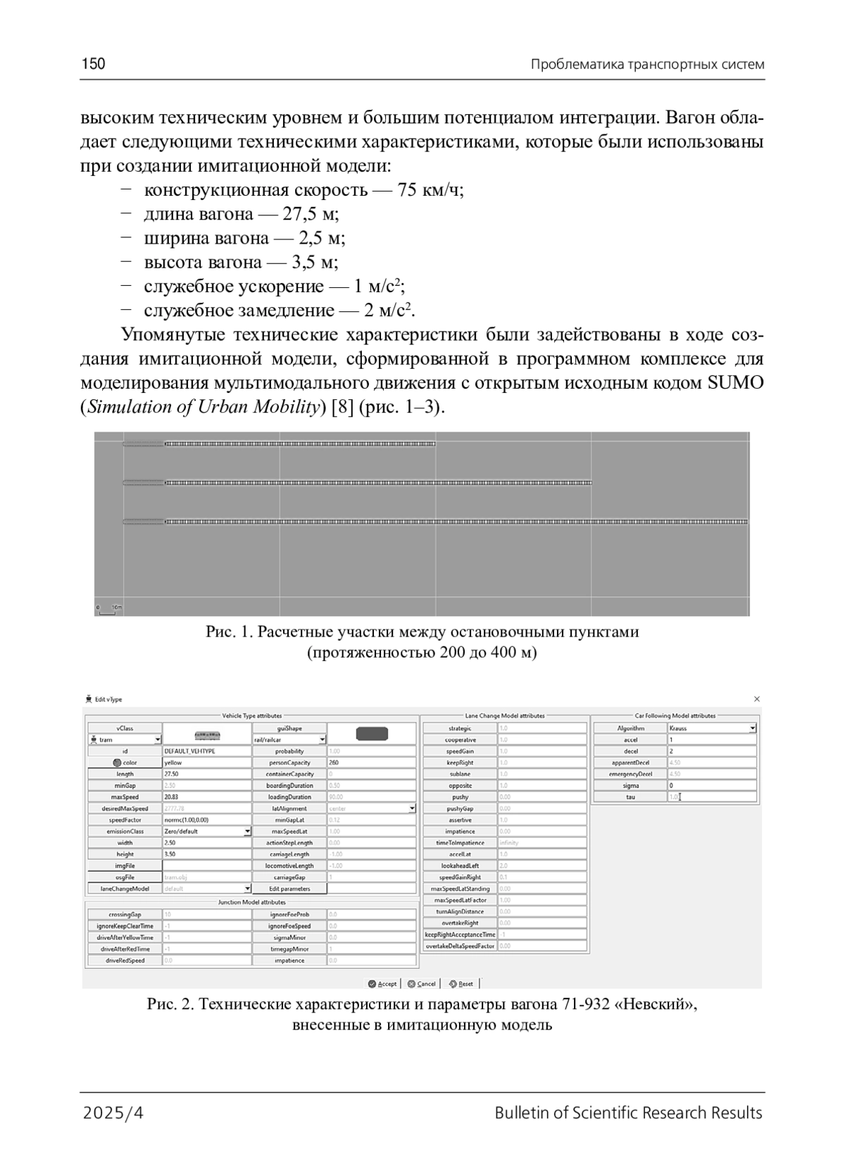 Цель: Разработать и обосновать математическую (компьютерную) модель взаимодействия многосекционного трамвайного экипажа с рельсовым путем, предназначенную для анализа поперечной устойчивости (виляния), вертикальной динамики и влияния параметров пути (ширина колеи, подуклонка, неровности и волнообразный износ) на безопасность и комфорт движения. Методы: Описана методика динамического моделирования движения трамвая в программном комплексе «Универсальный механизм» в виде сложной механической системы в постановке с инерционной моделью пути, детализированной шарнирно-силовой схемой экипажа и нелинейным контактом «колесо — рельс». Результаты: Приведены верификационные тесты и адаптация модели по данным натурного эксперимента, подтвердившие сходимость на уровне от 3 до 12,5 % по величине среднеквадратичных ускорений кузова. Результаты исследования подтвердили пригодность модели для обоснования норм по устройству и содержанию трамвайных путей на прямых участках. Практическая значимость: Разработанная модель может быть пригодна для обоснования выбора ширины колеи и подуклонки, допусков отклонений рельсовой колеи в плане и профиле, параметров допускаемого волнообразного износа, а также для оценки допустимых скоростей при заданном состоянии колес и пути. Работа дополняет существующие исследования взаимодействия экипажа и пути на рельсовом транспорте, характеризуя трамвайную кинематику, и демонстрирует воспроизводимую процедуру верификации и адаптации модели на натурных данных.