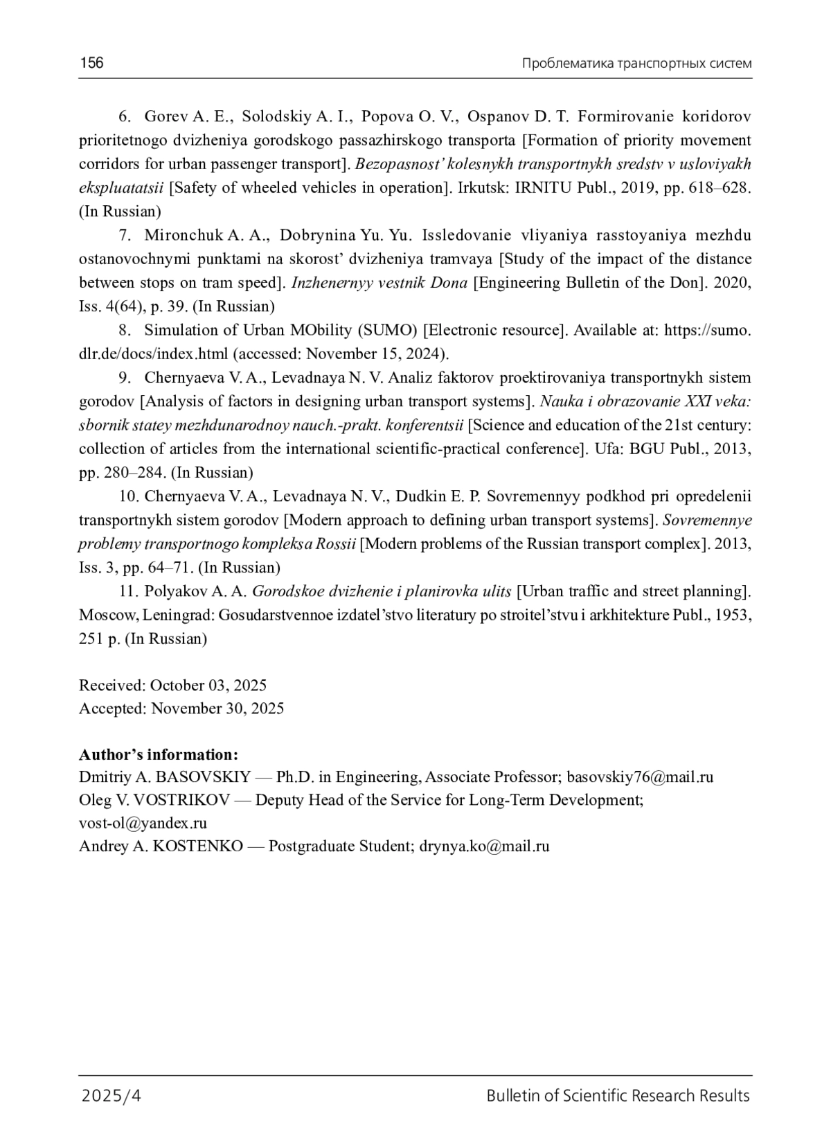 6. Горев А. Э. Формирование коридоров приоритетного движения городского пассажирского транспорта / А. Э. Горев, А. И. Солодский, О. В. Попова, Д. Т. Оспанов // Безопасность колесных транспортных средств в условиях эксплуатации. - Иркутск: ИРНИТУ, 2019. - С. 618-628.