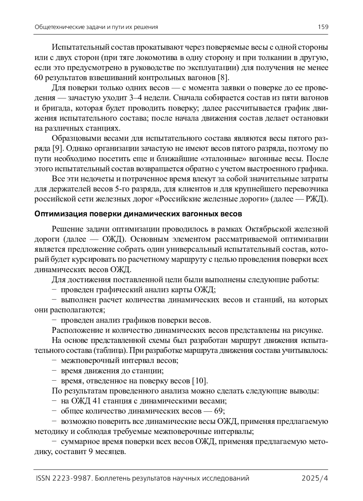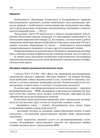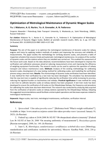 Цель: Цель работы заключается в оптимизации метрологического обслуживания динамических весов для железнодорожных вагонов и поездов путем применения современных методов анализа, повышения точности и надежности измерений. В работе изучена методика поверки динамических весов, предложена таблица с графиком поверок, обеспечивающая своевременное и систематическое проведение метрологического обслуживания. Проведен анализ количества динамических весов и станций, на которых они установлены, что позволило оценить масштабы будущих работ. На основе полученных данных разработаны рекомендации по улучшению процессов поверки и калибровки, направленные на снижение погрешностей измерений и повышение эффективности эксплуатации весового оборудования. Результаты работы могут быть использованы для оптимизации работы железнодорожного транспорта и снижения затрат на техническое обслуживание. Методы: Анализ существующей методики поверки динамических весов; разработка нового испытательного состава для поверки весов и моделирование процесса поверки с использованием нового испытательного состава. Результаты: Выявлены недостатки поверки динамических весов; разработан способ поверки испытательным составом. Моделирование показало, что испытательный состав способен существенно сократить время поверки и повысить ее эффективность, снизив нагрузку на логистику локомотивов и железнодорожных составов. Практическая значимость: Предложен новый метод использования испытательного состава для поверки динамических весов на железнодорожных станциях; разработан маршрут курсирования испытательного состава, обеспечивающий поверку всех весов на Октябрьской железной дороге; определены периодичность и порядок проведения поверки весов. Исследование проведено на основе анализа данных поверки динамических весов на железнодорожных станциях Октябрьской железной дороги. Реализация предложенных рекомендаций обеспечит непрерывность работы и снизит затраты на метрологическое обслуживание.