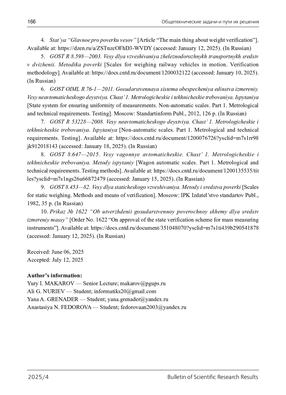 8. ГОСТ 8.647-2015. Весы вагонные автоматические. Часть 1. Метрологические и технические требования. Методы испытаний. - URL: https://docs.cntd.ru/document/1200135535/titles?ysclid=m7s1ngs26u66872479 (дата обращения: 15.01.2025).