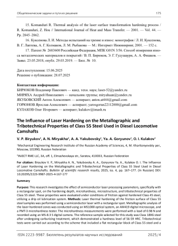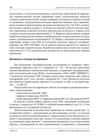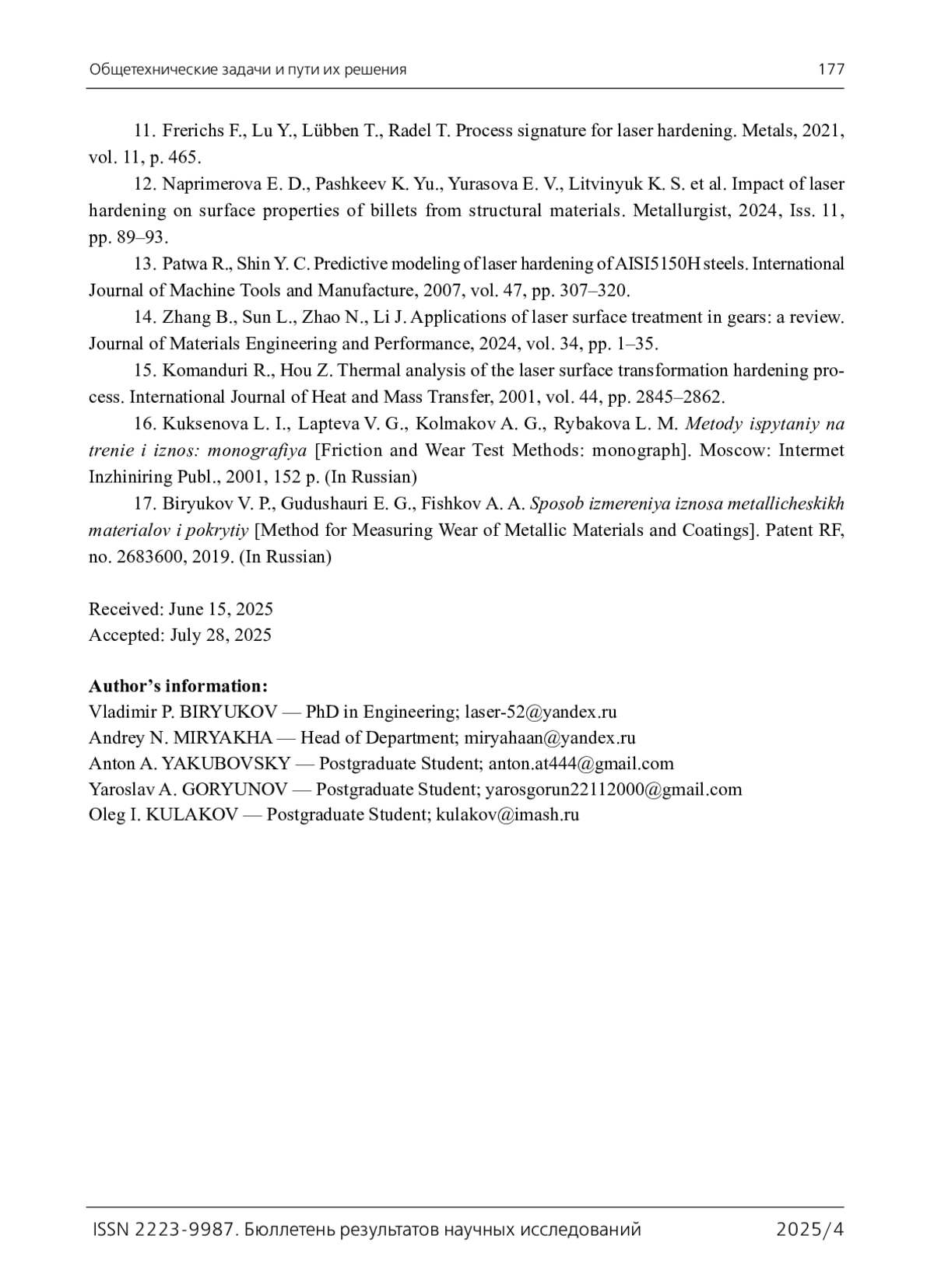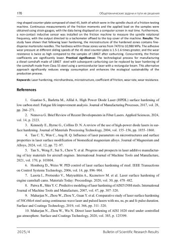 13. Zhang B. Applications of laser surface treatment in gears: a review / B. Zhang, L. Sun, N. Zhao, J. Li // Journal of Materials Engineering and Performance. - 2024. - Vol. 34. - Pp. 1-35. 2025/4 Bulletin оf Scientific Research ResultsОбщетехнические задачи и пути их решения 175.