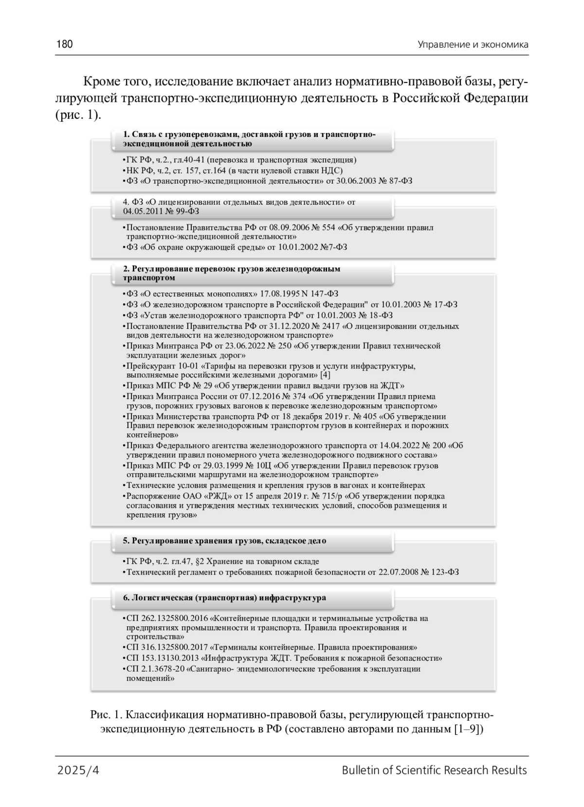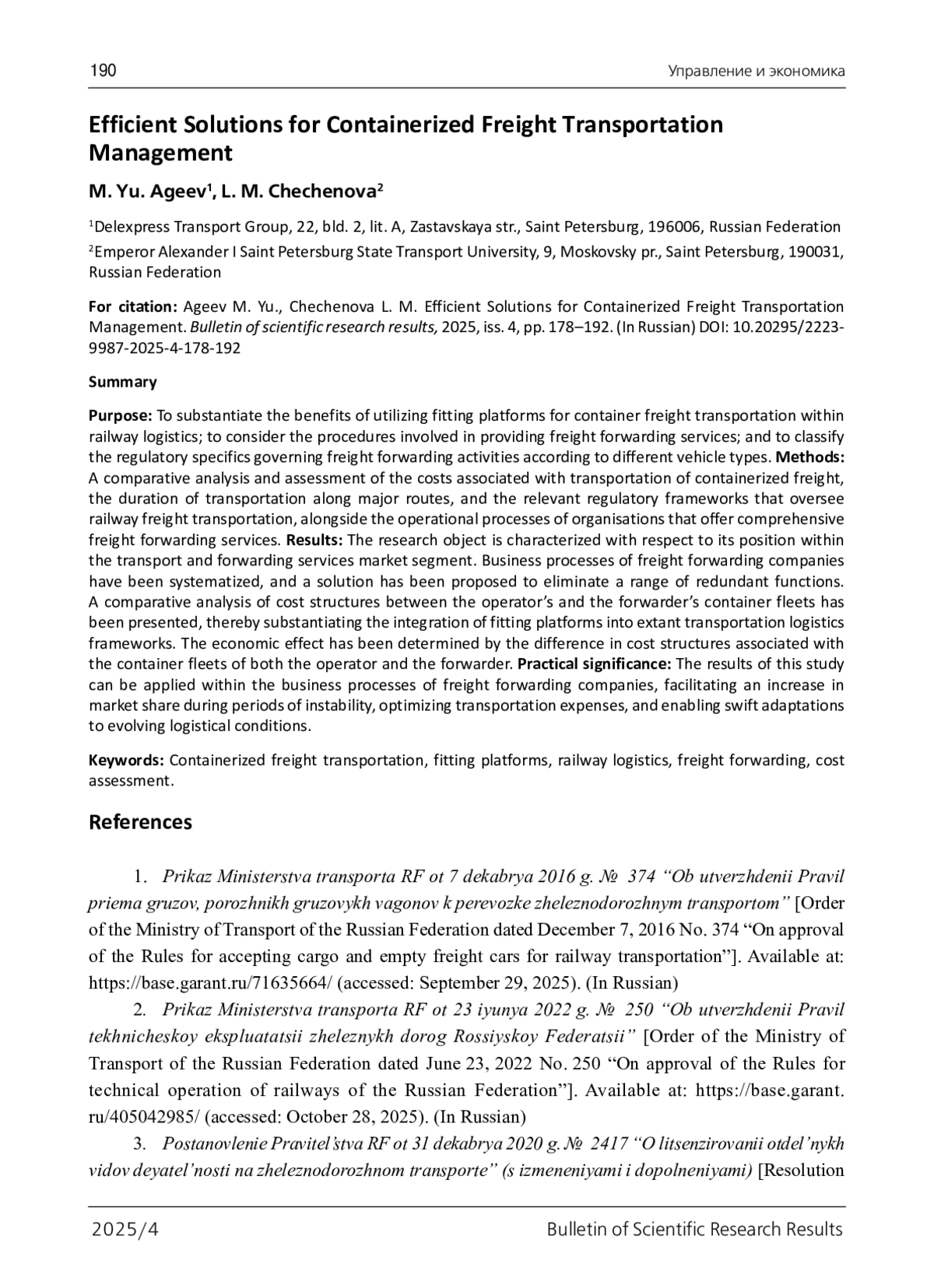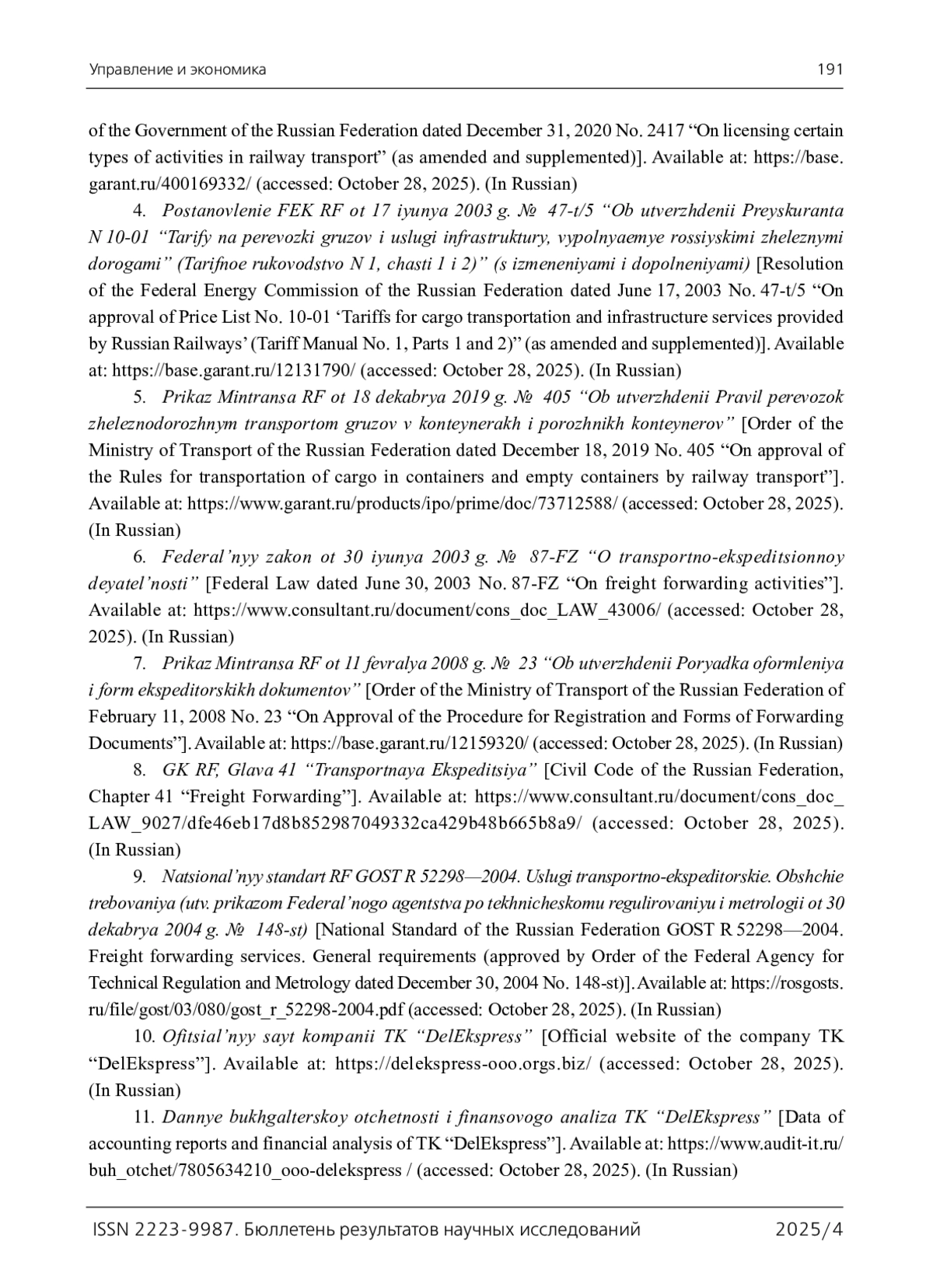 4. Постановление ФЭК РФ от 17 июня 2003 г. № 47-т/5 “Об утверждении Прейскуранта N 10-01 “Тарифы на перевозки грузов и услуги инфраструктуры, выполняемые российскими железными дорогами” (Тарифное руководство N 1, части 1 и 2)” (с изменениями и дополнениями). - URL: https://base.garant.ru/12131790/ (дата обращения: 28.10.2025). 2025/4 Bulletin оf Scientific Research ResultsУправление и экономика 189.