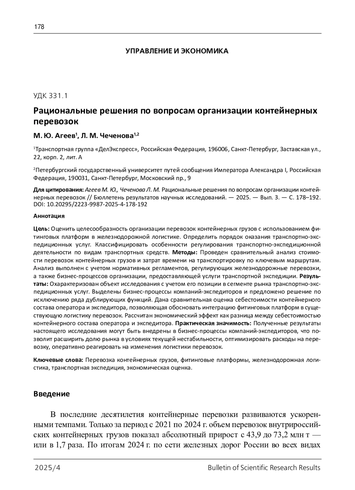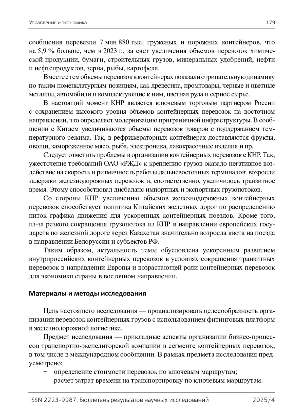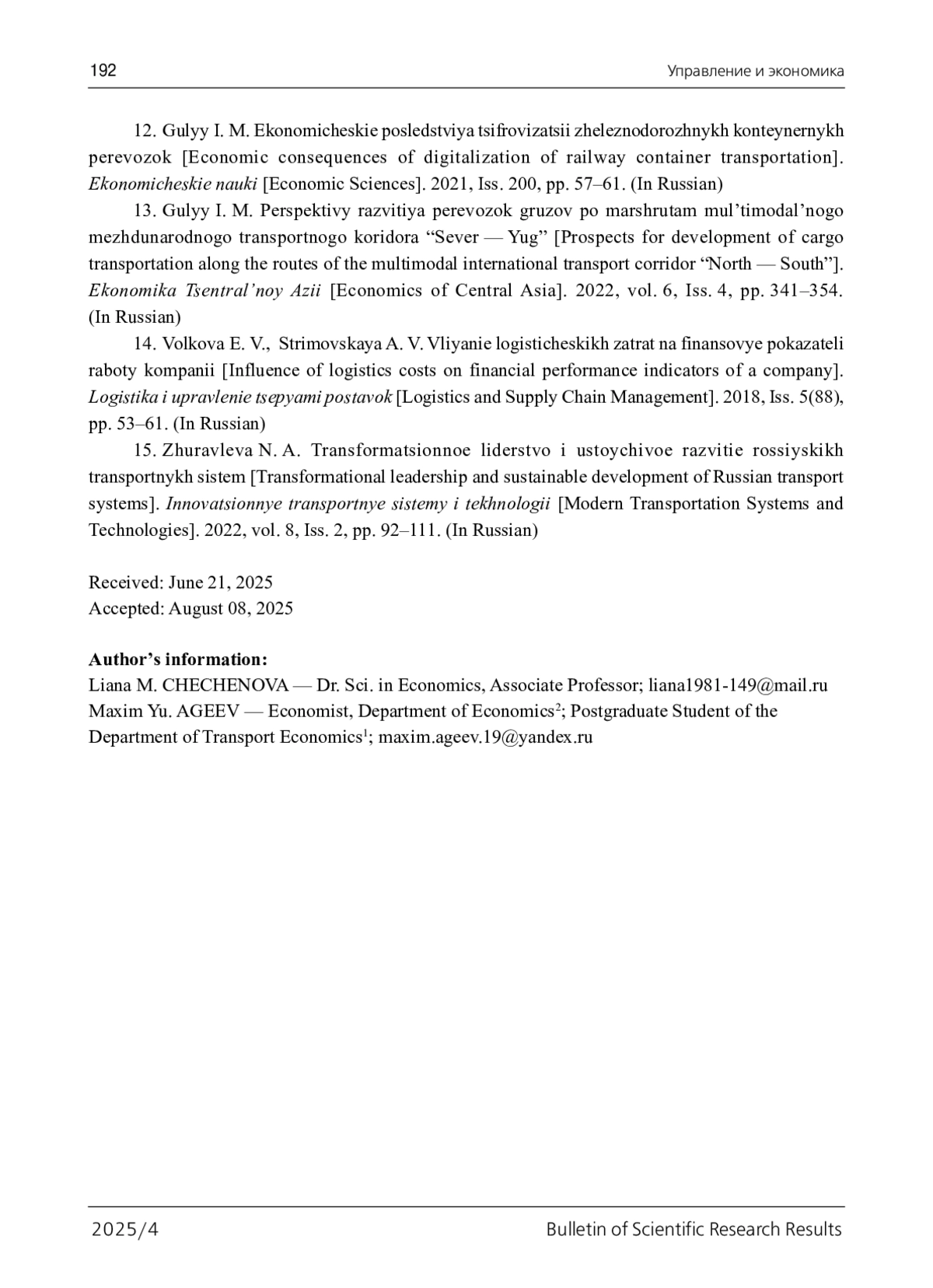 4. Постановление ФЭК РФ от 17 июня 2003 г. № 47-т/5 “Об утверждении Прейскуранта N 10-01 “Тарифы на перевозки грузов и услуги инфраструктуры, выполняемые российскими железными дорогами” (Тарифное руководство N 1, части 1 и 2)” (с изменениями и дополнениями). - URL: https://base.garant.ru/12131790/ (дата обращения: 28.10.2025). 2025/4 Bulletin оf Scientific Research ResultsУправление и экономика 189.