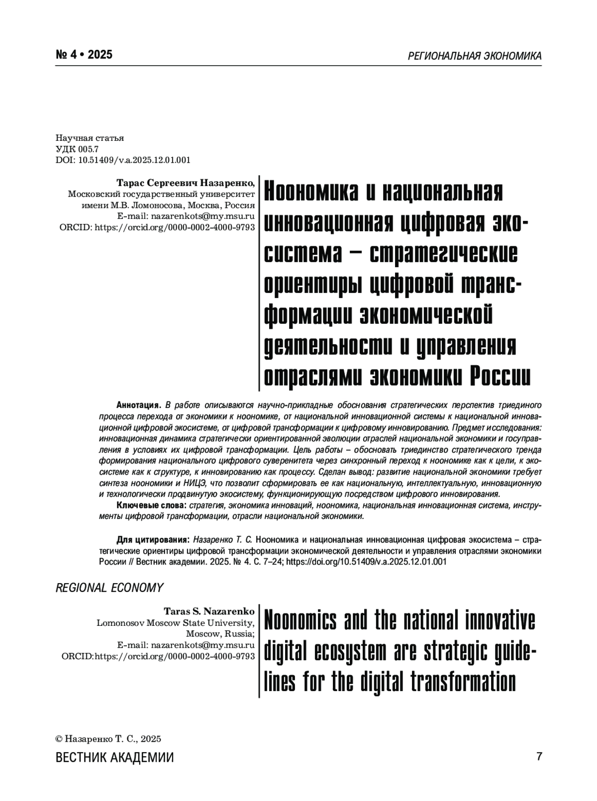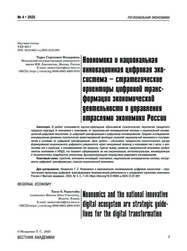 В работе описываются научно-прикладные обоснования стратегических перспектив триединого процесса перехода от экономики к ноономике, от национальной инновационной системы к национальной инновационной цифровой экосистеме, от цифровой трансформации к цифровому инновированию. Предмет исследования: инновационная динамика стратегически ориентированной эволюции отраслей национальной экономики и госуправления в условиях их цифровой трансформации. Цель работы – обосновать триединство стратегического тренда формирования национального цифрового суверенитета через синхронный переход к ноономике как к цели, к экосистеме как к структуре, к инновированию как процессу. Сделан вывод: развитие национальной экономики требует синтеза ноономики и НИЦЭ, что позволит сформировать ее как национальную, интеллектуальную, инновационную и технологически продвинутую экосистему, функционирующую посредством цифрового инновирования.