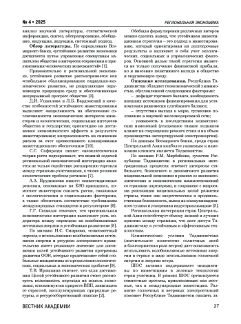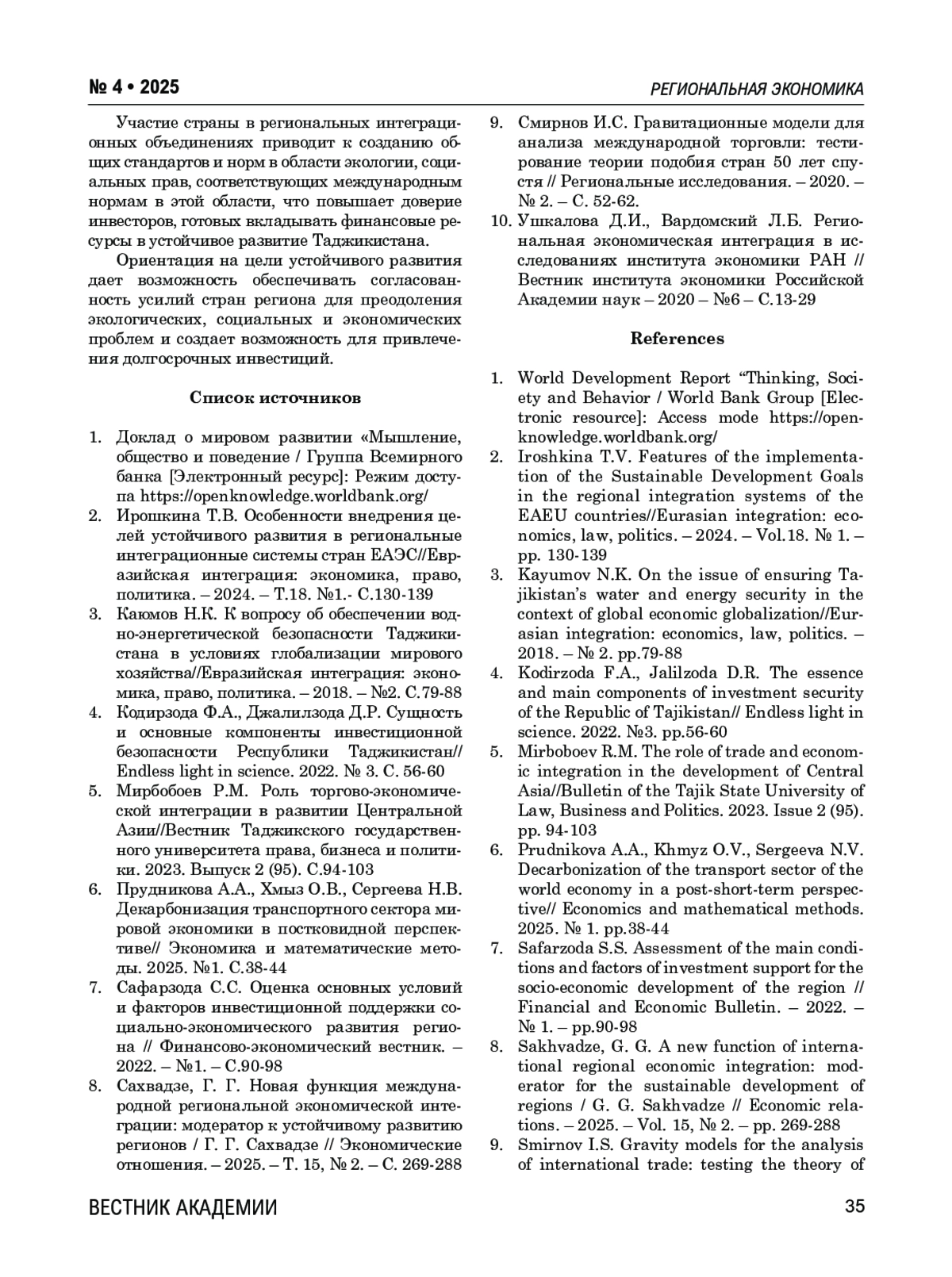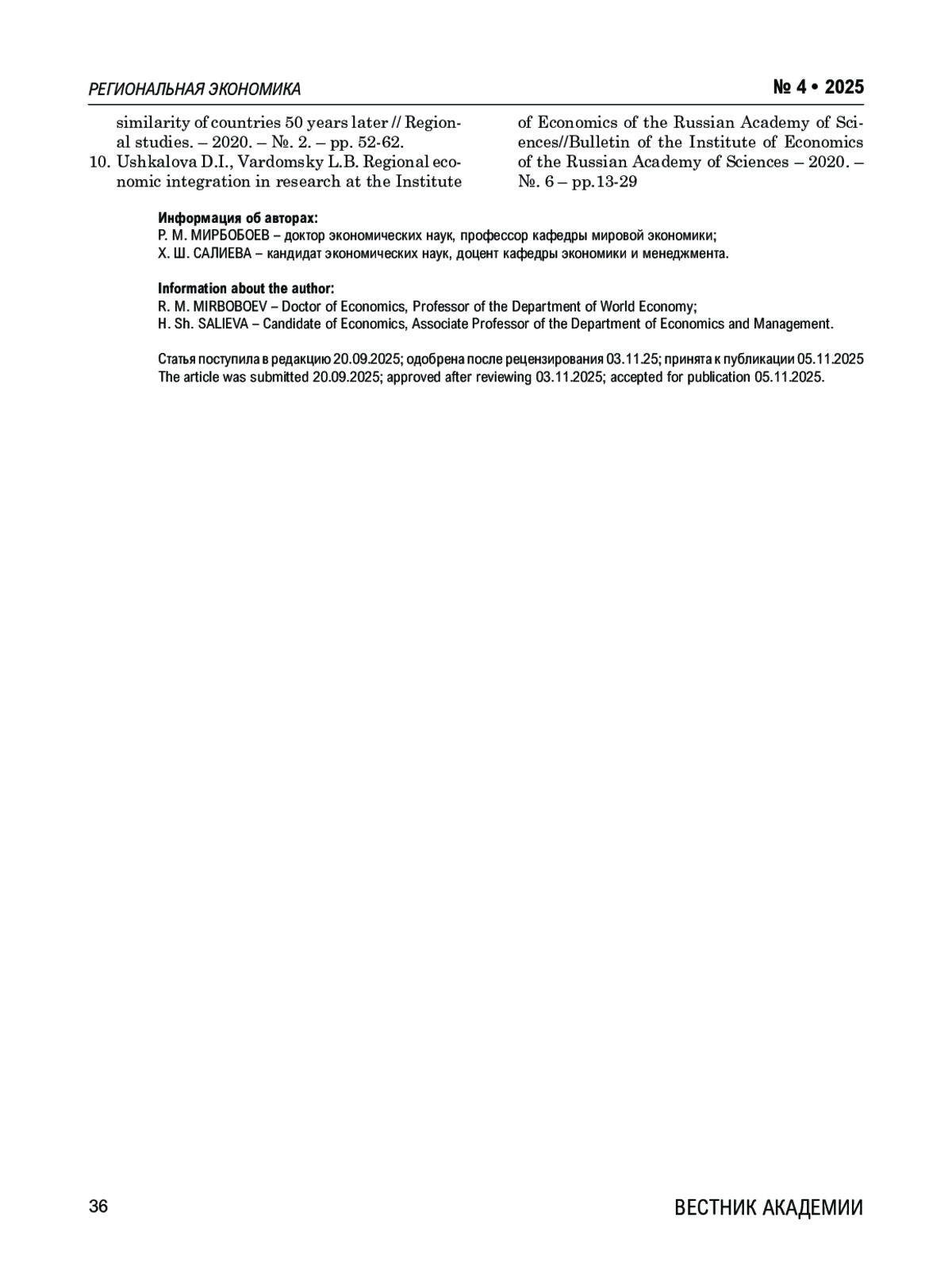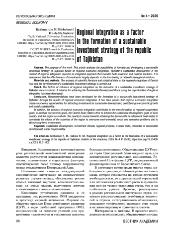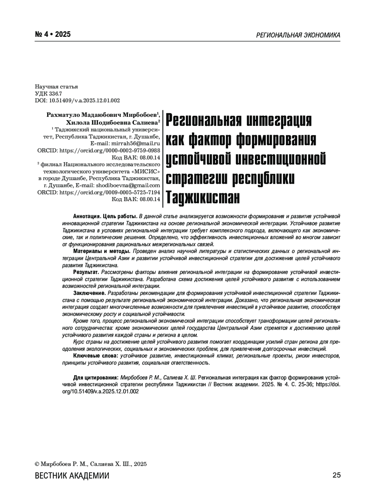 МИРБОБОЕВ Р. М., САЛИЕВА Х. Ш. РЕГИОНАЛЬНАЯ ИНТЕГРАЦИЯ КАК ФАКТОР ФОРМИРОВАНИЯ УСТОЙЧИВОЙ ИНВЕСТИЦИОННОЙ СТРАТЕГИИ РЕСПУБЛИКИ ТАДЖИКИСТАН // ВЕСТНИК АКАДЕМИИ. 2025. № 4