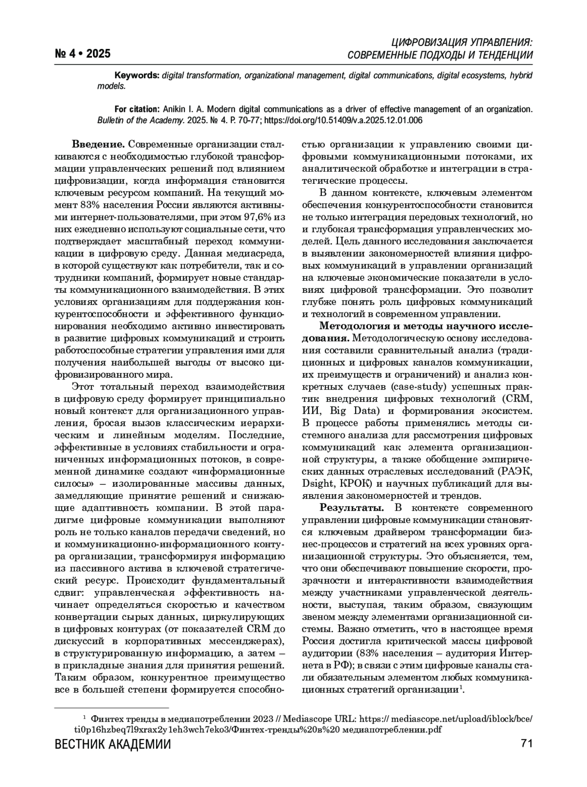 Современные организации сталкиваются с необходимостью глубокой трансформации управленческих решений под влиянием цифровизации, когда информация становится ключевым ресурсом компаний. На текущий момент 83% населения России являются активными интернет-пользователями, при этом 97,6% из них ежедневно используют социальные сети, что подтверждает масштабный переход коммуникации в цифровую среду. Данная медиасреда, в которой существуют как потребители, так и сотрудники компаний, формирует новые стандарты коммуникационного взаимодействия. В этих условиях организациям для поддержания конкурентоспособности и эффективного функционирования необходимо активно инвестировать в развитие цифровых коммуникаций и строить работоспособные стратегии управления ими для получения наибольшей выгоды от высоко цифровизированного мира.