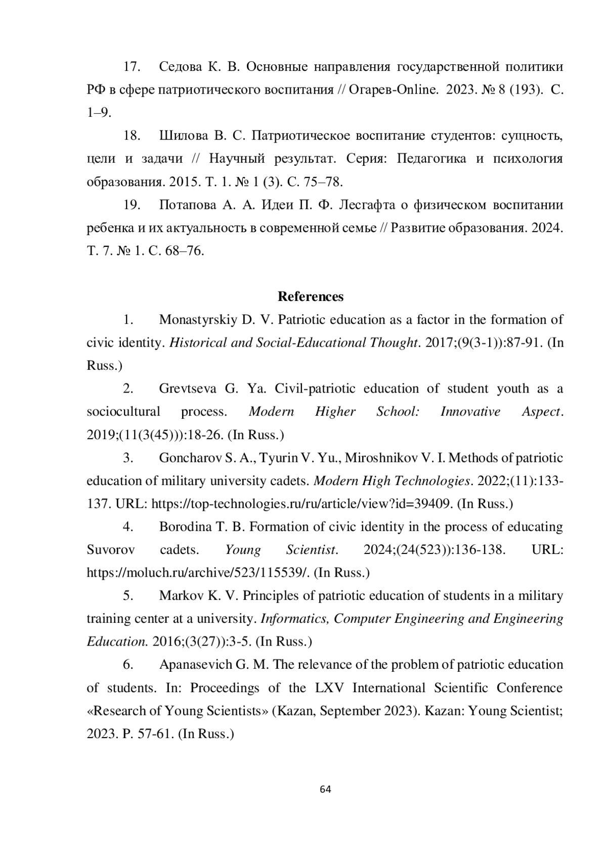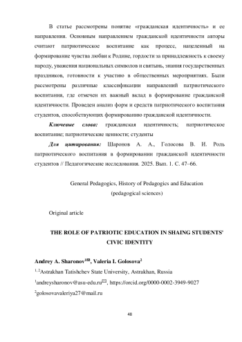 14. Казаева Е. А., Чхетиани Н. С., Пономарева Л. И. Патриотизм как инструмент формирования гражданской идентичности: анализ представлений студентов // Мир науки. Педагогика и психология. 2023. Т. 11. № 2. С. 1-12. URL: https://mir-nauki.com/PDF/23PDMN223.pdf. EDN: BMJFHL