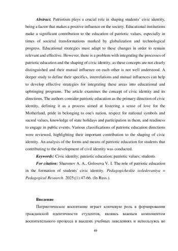 Патриотическое воспитание играет ключевую роль в формировании гражданской идентичности студентов, являясь важным компонентом воспитательного процесса в высших учебных заведениях и используясь во многих педагогических практиках. Д. В. Монастырский отмечает: «рассмотрение вопроса гражданственности неразрывно связано с рассмотрением вопроса патриотизма» [1, с. 87].