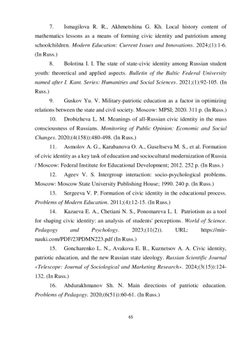 7. Исмагилова Р. Р., Ахметшина Г. Х. Краеведческое содержание уроков математики как средство формирования гражданской идентичности и патриотизма школьников // Современное образование: актуальные вопросы и инновации. 2024. № 1. С. 1-6. EDN: ZFTHTZ
