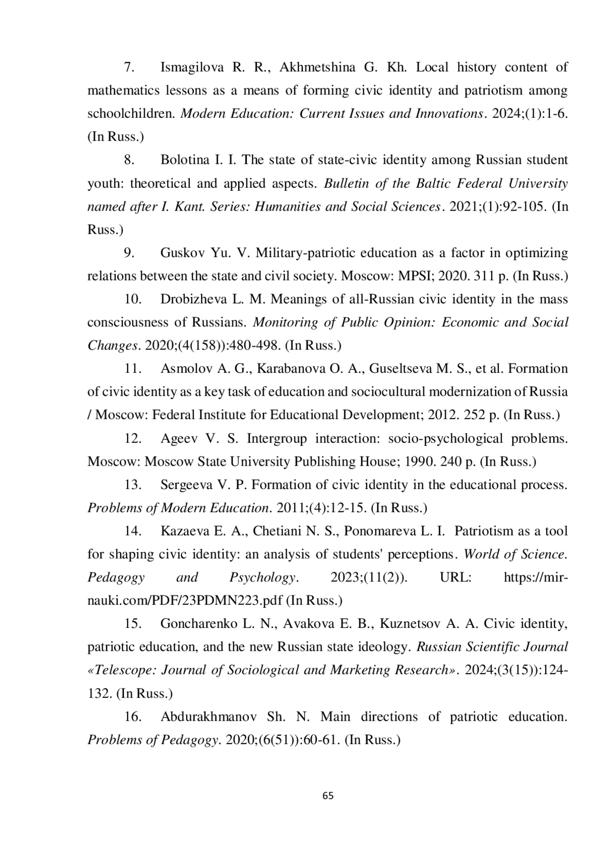 15. Гончаренко Л. Н., Авакова Э. Б., Кузнецов А. А. Гражданская идентичность, патриотическое воспитание и новая Российская государственная идеология // Российский научный журнал “Телескоп: журнал социологических и маркетинговых исследований”. 2024. № 3 (15). С. 124-132. EDN: HLSVEL