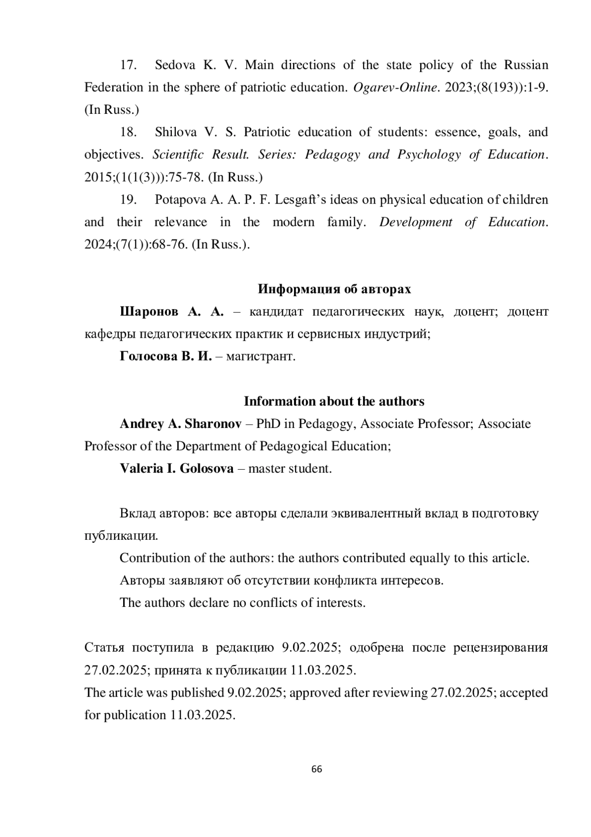 19. Потапова А. А. Идеи П. Ф. Лесгафта о физическом воспитании ребенка и их актуальность в современной семье // Развитие образования. 2024. Т. 7. № 1. С. 68-76. EDN: IOZHOC