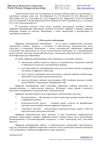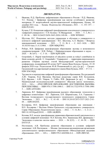 8. Котлярова, И.О. Цифровая трансформация образования как инновация / И.О. Котлярова // Вестник Южно-Уральского государственного университета. Серия: Образование. Педагогические науки. - 2022. - Т. 14, № 1. - С. 6-21. DOI: 10.14529/ped220101 EDN: AKJRDN