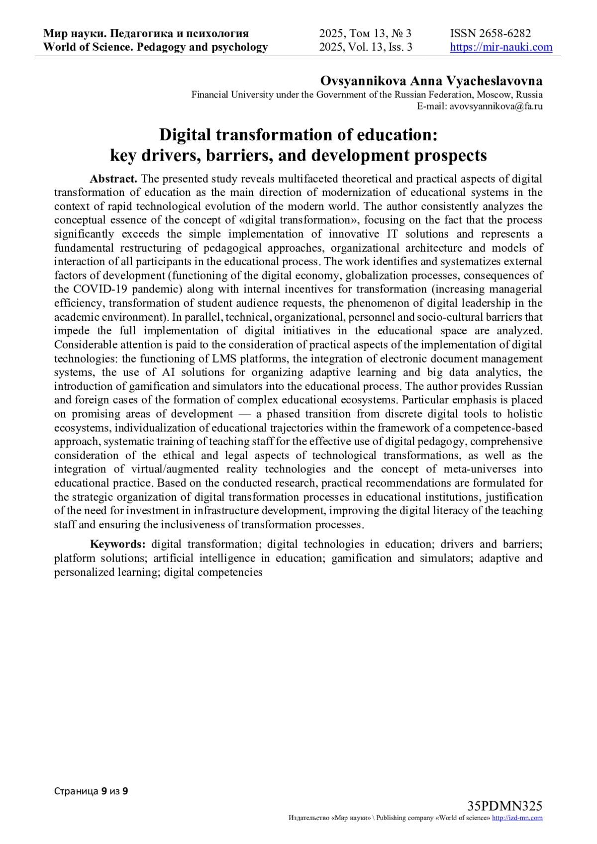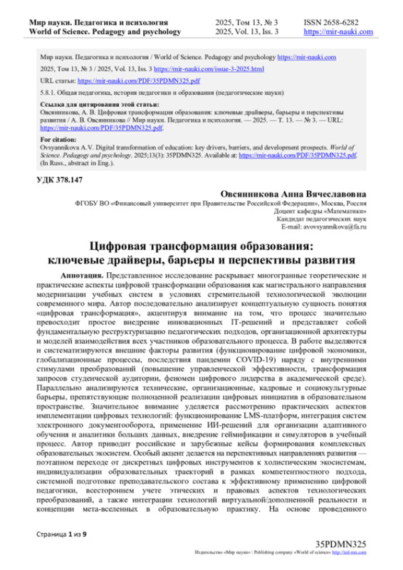 Представленное исследование раскрывает многогранные теоретические и практические аспекты цифровой трансформации образования как магистрального направления модернизации учебных систем в условиях стремительной технологической эволюции современного мира. Автор последовательно анализирует концептуальную сущность понятия «цифровая трансформация», акцентируя внимание на том, что процесс значительно превосходит простое внедрение инновационных IT-решений и представляет собой фундаментальную реструктуризацию педагогических подходов, организационной архитектуры и моделей взаимодействия всех участников образовательного процесса. В работе выделяются и систематизируются внешние факторы развития (функционирование цифровой экономики, глобализационные процессы, последствия пандемии COVID-19) наряду с внутренними стимулами преобразований (повышение управленческой эффективности, трансформация запросов студенческой аудитории, феномен цифрового лидерства в академической среде). Параллельно анализируются технические, организационные, кадровые и социокультурные барьеры, препятствующие полноценной реализации цифровых инициатив в образовательном пространстве. Значительное внимание уделяется рассмотрению практических аспектов имплементации цифровых технологий: функционирование LMS-платформ, интеграция систем электронного документооборота, применение ИИ-решений для организации адаптивного обучения и аналитики больших данных, внедрение геймификации и симуляторов в учебный процесс. Автор приводит российские и зарубежные кейсы формирования комплексных образовательных экосистем. Особый акцент делается на перспективных направлениях развития - поэтапном переходе от дискретных цифровых инструментов к холистическим экосистемам, индивидуализации образовательных траекторий в рамках компетентностного подхода, системной подготовке преподавательского состава к эффективному применению цифровой педагогики, всестороннем учете этических и правовых аспектов технологических преобразований, а также интеграции технологий виртуальной/дополненной реальности и концепции мета-вселенных в образовательную практику. На основе проведенного исследования формулируются практические рекомендации по стратегической организации процессов цифровой трансформации в учреждениях образования, обоснованию необходимости инвестиций в инфраструктурное развитие, повышению цифровой грамотности педагогического корпуса и обеспечению инклюзивности трансформационных процессов.