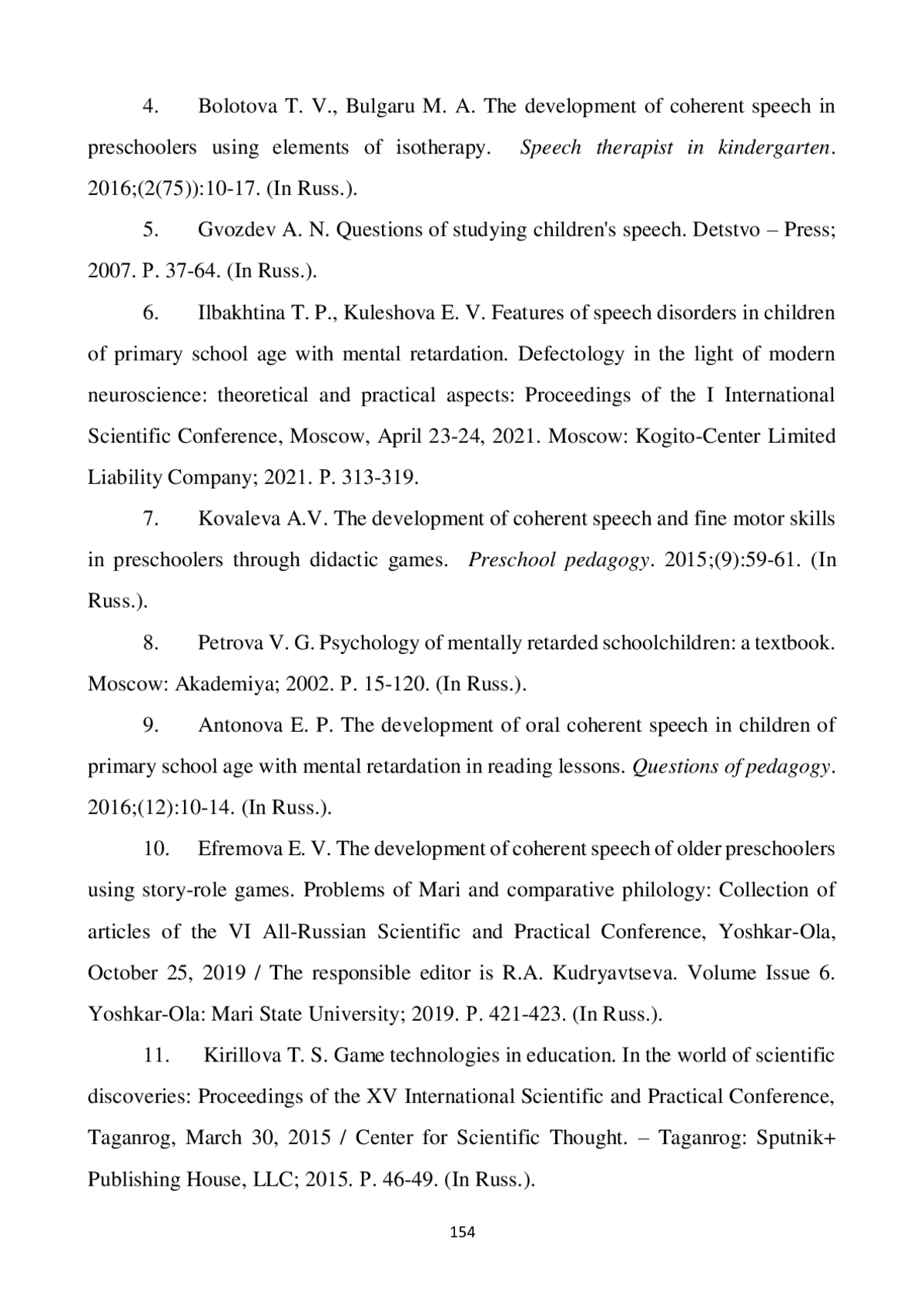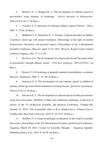 10. Ефремова Е. В. Развитие связной речи старших дошкольников с помощью сюжетно-ролевых игр // Проблемы Марийской и сравнительной филологии: сборник статей VI Всероссийской научно-практической конференции, Йошкар-Ола, 25 октября 2019 года / Ответственный редактор Р. А. Кудрявцева. Вып. 6. Йошкар-Ола: Марийский государственный университет, 2019. С. 421-423. EDN: HLOVUW