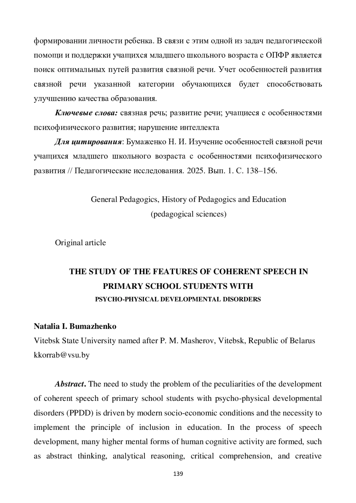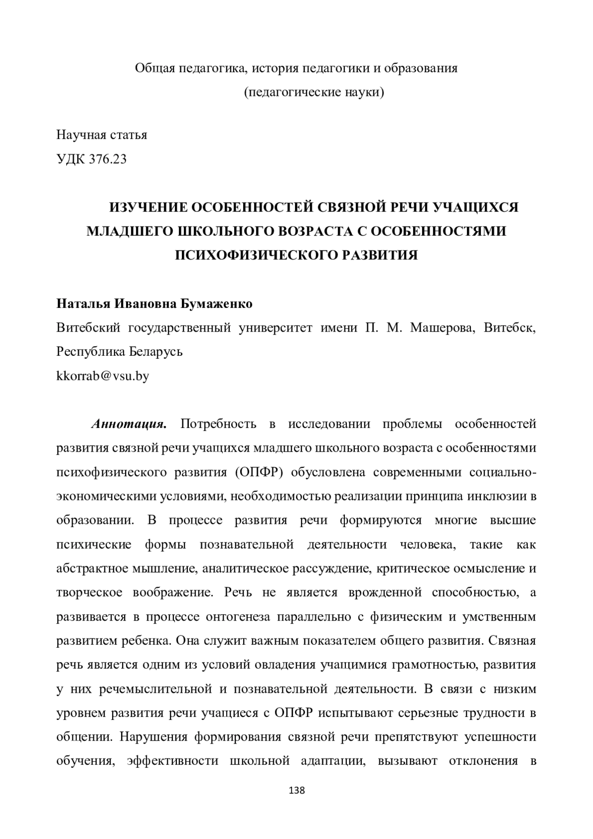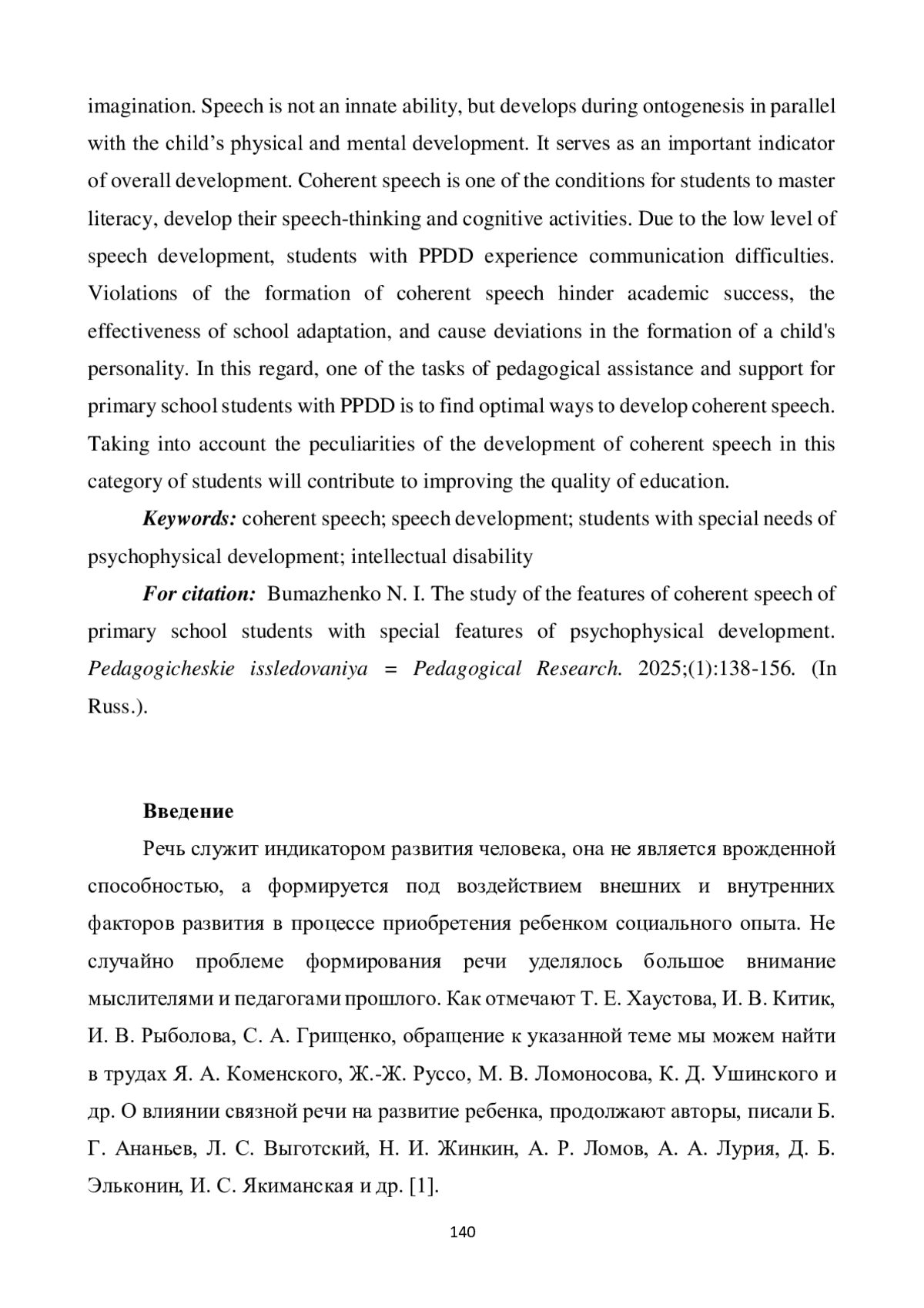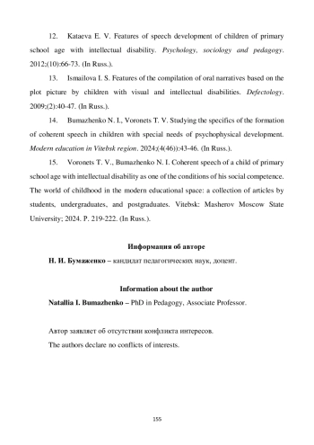 14. Бумаженко Н. И., Воронец Т. В. Изучение специфики формирования связной речи у детей с особенностями психофизического развития // Современное образование Витебщины. 2024. № 4 (46). С. 43-46. EDN: NFEDUK