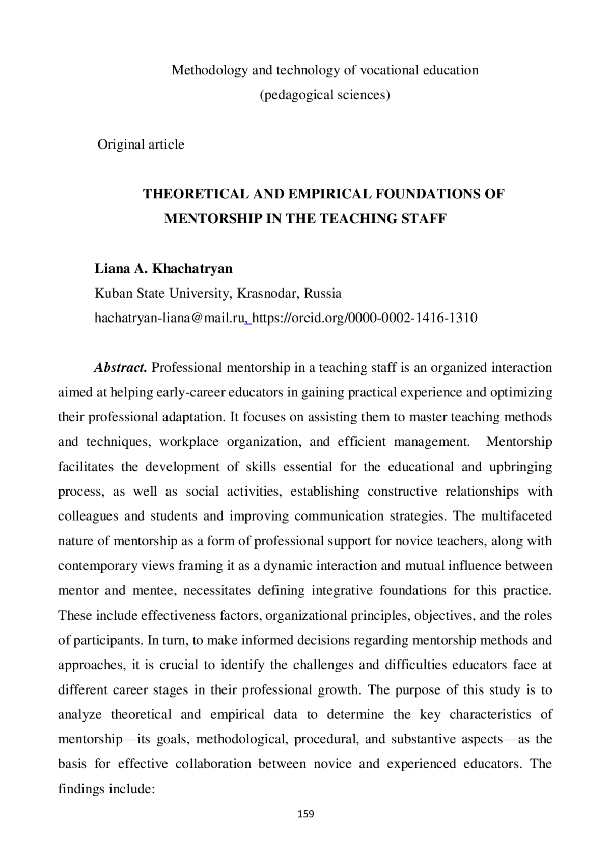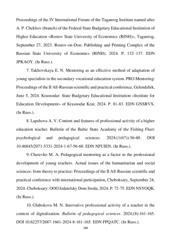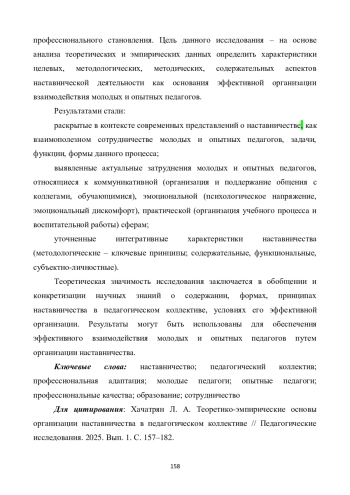 Профессиональное наставничество в педагогическом коллективе - это организованное взаимодействие, направленное на помощь молодым педагогам в накоплении практического опыта, оптимизации их профессиональной адаптации. Оно ориентировано на содействие в освоении методов и приемов труда, способов организации рабочего места и рационального распределения времени. Наставничество способствует более эффективному развитию навыков осуществления учебно-воспитательного процесса и общественной деятельности, установлению конструктивных отношений с коллегами и обучающимися, организации общения с ними и пр. Многоаспектность наставничества как формы сопровождения профессиональной адаптации молодых педагогов, современные представления о нем как о взаимодействии и взаимовлиянии наставника и подопечного требуют определения интегративных основ деятельности: факторов эффективности и принципов организации, задач и функций субъектов и т. д. В свою очередь, для обоснованного выбора форм, методов и принципов работы наставника и молодого педагога необходимо определить совокупность трудностей и проблем, с которыми встречаются педагоги разных возрастов на пути своего профессионального становления. Цель данного исследования - на основе анализа теоретических и эмпирических данных определить характеристики целевых, методологических, методических, содержательных аспектов наставнической деятельности как основания эффективной организации взаимодействия молодых и опытных педагогов. Результатами стали: раскрытые в контексте современных представлений о наставничестве, как взаимополезном сотрудничестве молодых и опытных педагогов, задачи, функции, формы данного процесса; выявленные актуальные затруднения молодых и опытных педагогов, относящиеся к коммуникативной (организация и поддержание общения с коллегами, обучающимися), эмоциональной (психологическое напряжение, эмоциональный дискомфорт), практической (организация учебного процесса и воспитательной работы) сферам; уточненные интегративные характеристики наставничества (методологические - ключевые принципы; содержательные, функциональные, субъектно-личностные). Теоретическая значимость исследования заключается в обобщении и конкретизации научных знаний о содержании, формах, принципах наставничества в педагогическом коллективе, условиях его эффективной организации. Результаты могут быть использованы для обеспечения эффективного взаимодействия молодых и опытных педагогов путем организации наставничества.