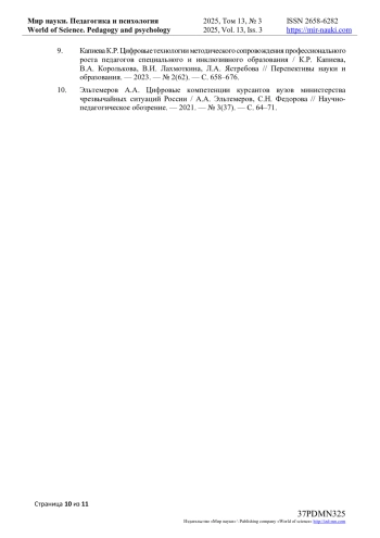 10. Эльтемеров А.А. Цифровые компетенции курсантов вузов министерства чрезвычайных ситуаций России / А.А. Эльтемеров, С.Н. Федорова // Научно-педагогическое обозрение. - 2021. - № 3(37). - С. 64-71. EDN: FWFBWW