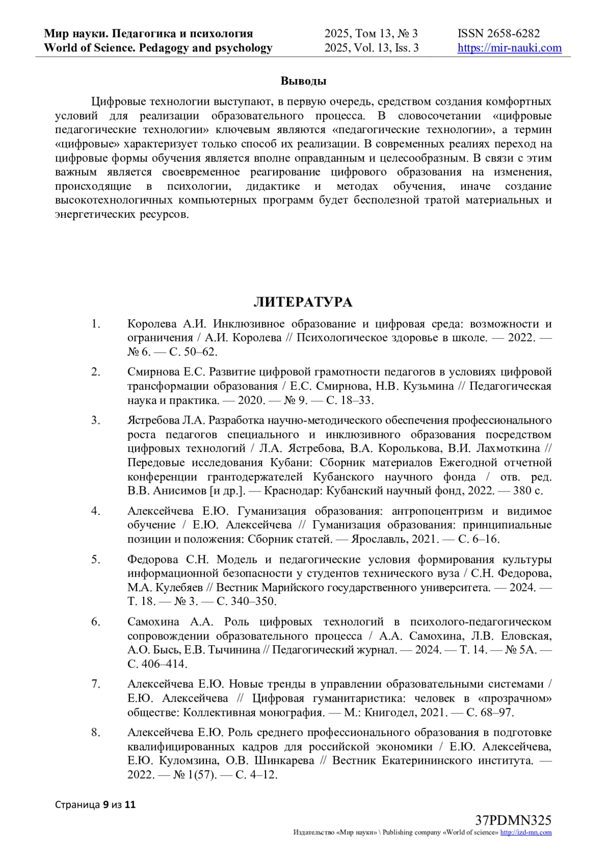1. Королева А.И. Инклюзивное образование и цифровая среда: возможности и ограничения / А.И. Королева // Психологическое здоровье в школе. - 2022. - № 6. - С. 50-62.