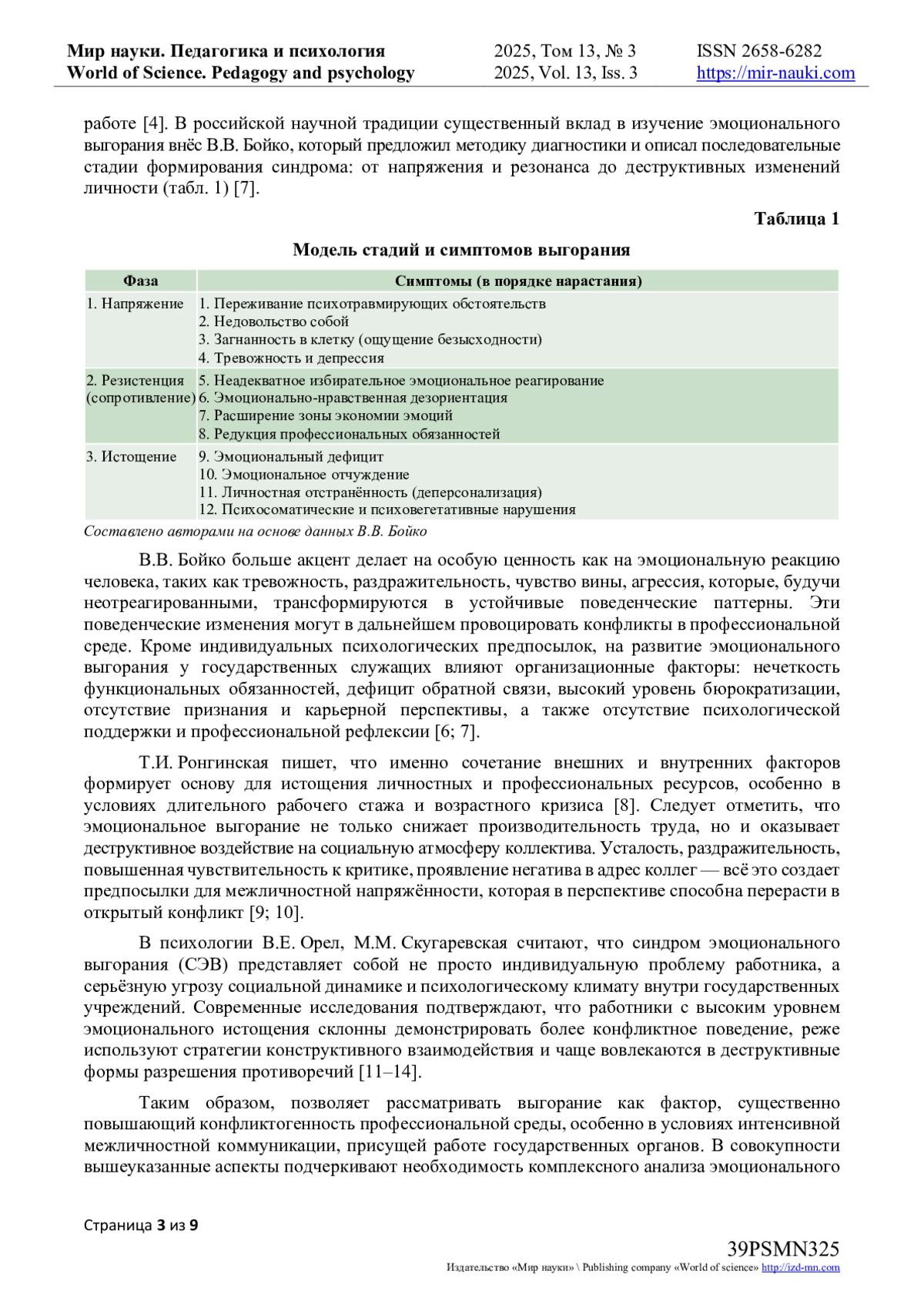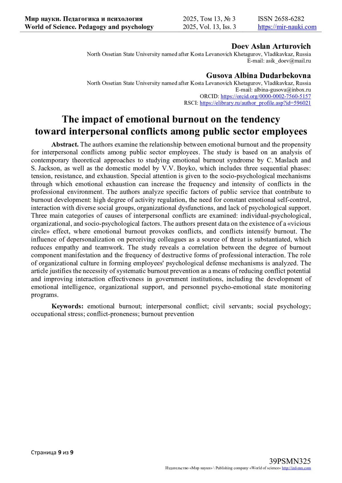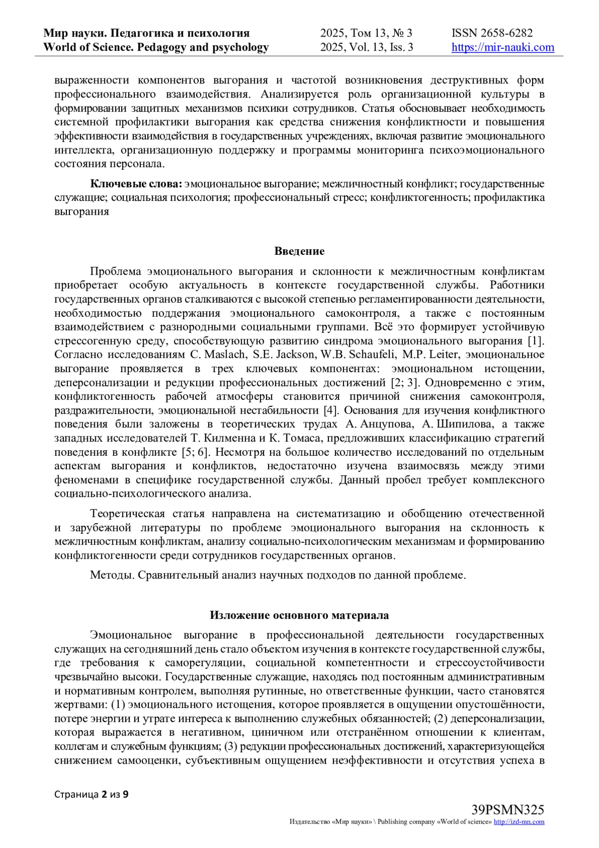 Авторами в статье рассматривается взаимосвязь между эмоциональным выгоранием и склонностью к межличностным конфликтам у сотрудников государственных органов. Исследование базируется на анализе современных теоретических подходов к изучению синдрома эмоционального выгорания К. Маслач и С. Джексон, а также отечественной модели В. В. Бойко, включающей три последовательные фазы: напряжение, резистенцию и истощение. Особое внимание уделено социально-психологическим механизмам, посредством которых эмоциональное истощение может увеличивать частоту и интенсивность конфликтов в профессиональной среде. Авторами анализируются специфические факторы государственной службы, способствующие развитию выгорания: высокая степень регламентированности деятельности, необходимость постоянного эмоционального самоконтроля, взаимодействие с разнородными социальными группами, организационные дисфункции и дефицит психологической поддержки. Рассматриваются три основные категории причин межличностных конфликтов: индивидуально-психологические, организационные и социально-психологические факторы. Авторами представлены данные о существовании эффекта «порочного круга», когда эмоциональное выгорание провоцирует конфликты, а конфликты усиливают выгорание. Обосновывается влияние деперсонализации на восприятие коллег как источника угрозы, что снижает эмпатию и командную работу. Исследование выявляет корреляцию между степенью выраженности компонентов выгорания и частотой возникновения деструктивных форм профессионального взаимодействия. Анализируется роль организационной культуры в формировании защитных механизмов психики сотрудников. Статья обосновывает необходимость системной профилактики выгорания как средства снижения конфликтности и повышения эффективности взаимодействия в государственных учреждениях, включая развитие эмоционального интеллекта, организационную поддержку и программы мониторинга психоэмоционального состояния персонала.