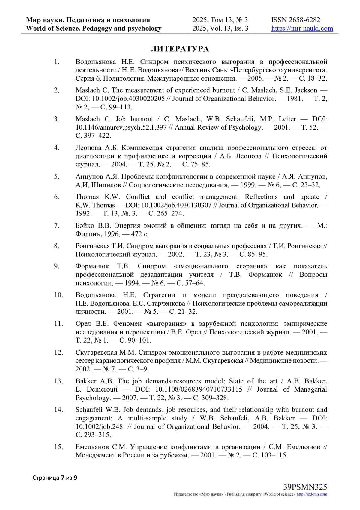 3. Maslach C. Job burnout / C. Maslach, W.B. Schaufeli, M.P. Leiter - // Annual Review of Psychology. - 2001. - Т. 52. - С. 397-422. DOI: 10.1146/annurev.psych.52.1.397 EDN: HEYQKD