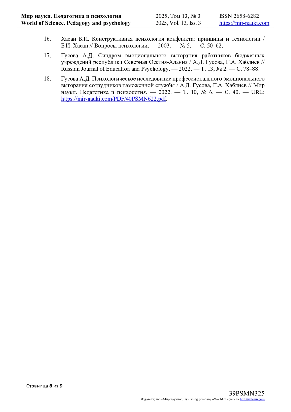 17. Гусова А.Д. Синдром эмоционального выгорания работников бюджетных учреждений республики Северная Осетия-Алания / А.Д. Гусова, Г.А. Хаблиев // Russian Journal of Education and Psychology. - 2022. - Т. 13, № 2. - С. 78-88. EDN: NWCAKM