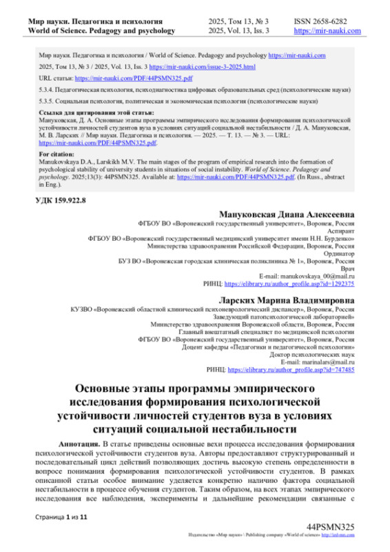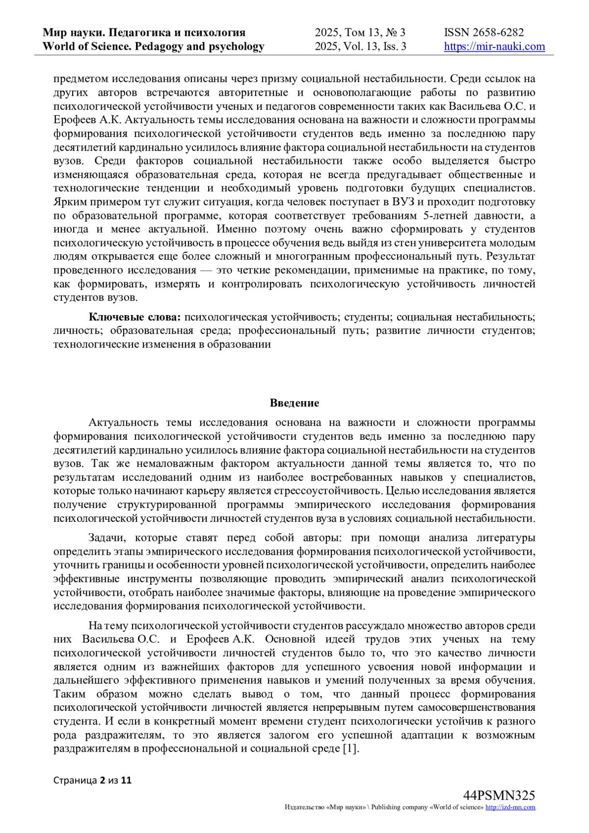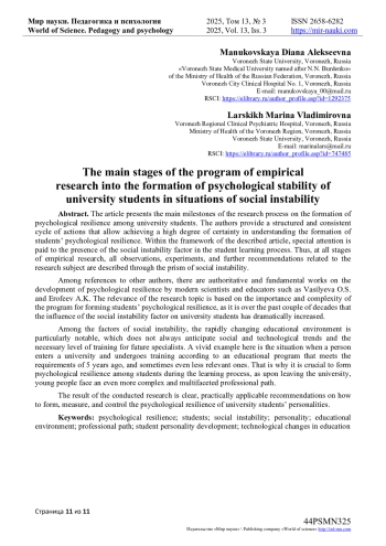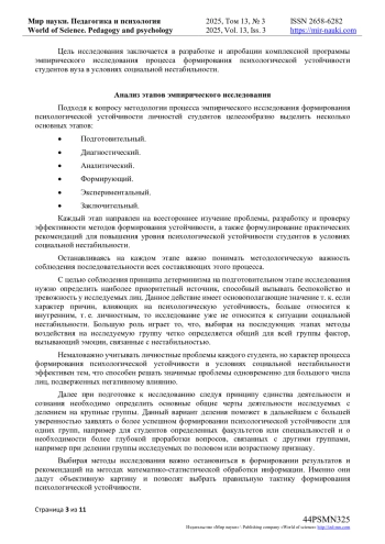 В статье приведены основные вехи процесса исследования формирования психологической устойчивости студентов вуза. Авторы предоставляют структурированный и последовательный цикл действий позволяющих достичь высокую степень определенности в вопросе понимания формирования психологической устойчивости студентов. В рамках описанной статьи особое внимание уделяется конкретно наличию фактора социальной нестабильности в процессе обучения студентов. Таким образом, на всех этапах эмпирического исследования все наблюдения, эксперименты и дальнейшие рекомендации связанные с предметом исследования описаны через призму социальной нестабильности. Среди ссылок на других авторов встречаются авторитетные и основополагающие работы по развитию психологической устойчивости ученых и педагогов современности таких как Васильева О. С. и Ерофеев А. К. Актуальность темы исследования основана на важности и сложности программы формирования психологической устойчивости студентов ведь именно за последнюю пару десятилетий кардинально усилилось влияние фактора социальной нестабильности на студентов вузов. Среди факторов социальной нестабильности также особо выделяется быстро изменяющаяся образовательная среда, которая не всегда предугадывает общественные и технологические тенденции и необходимый уровень подготовки будущих специалистов. Ярким примером тут служит ситуация, когда человек поступает в ВУЗ и проходит подготовку по образовательной программе, которая соответствует требованиям 5-летней давности, а иногда и менее актуальной. Именно поэтому очень важно сформировать у студентов психологическую устойчивость в процессе обучения ведь выйдя из стен университета молодым людям открывается еще более сложный и многогранным профессиональный путь.