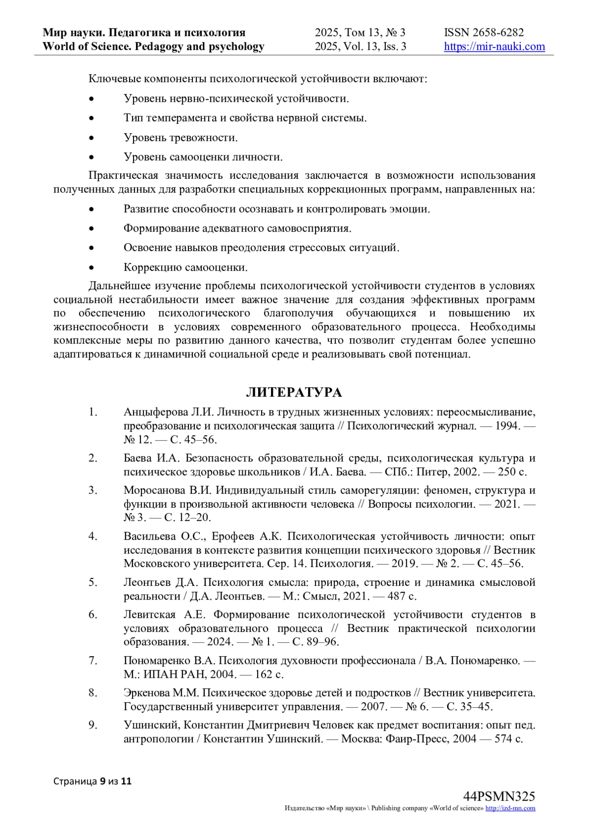 6. Левитская А.Е. Формирование психологической устойчивости студентов в условиях образовательного процесса // Вестник практической психологии образования. - 2024. - № 1. - С. 89-96.
