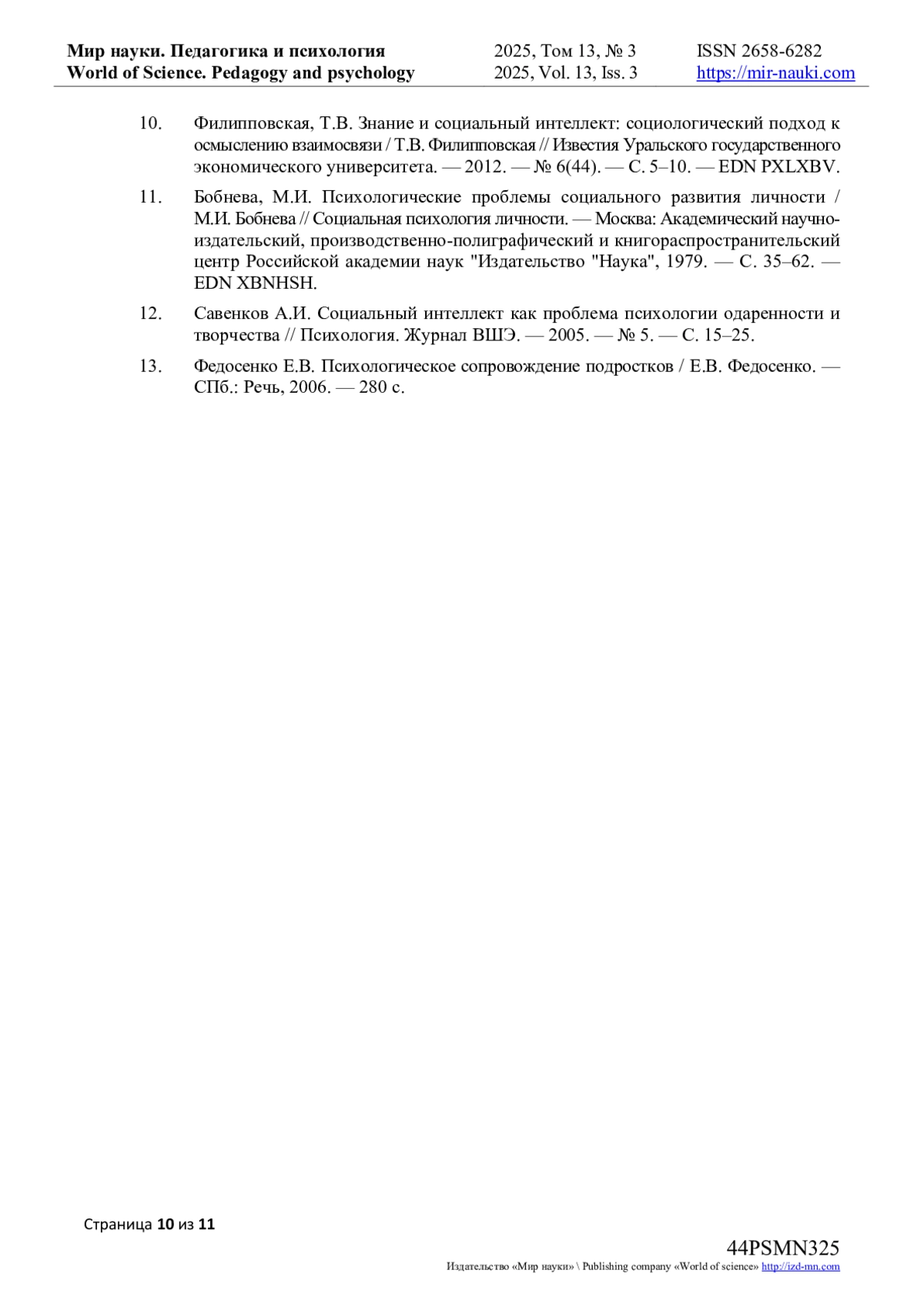 10. Филипповская, Т.В. Знание и социальный интеллект: социологический подход к осмыслению взаимосвязи / Т.В. Филипповская // Известия Уральского государственного экономического университета. - 2012. - № 6(44). - С. 5-10. EDN: PXLXBV